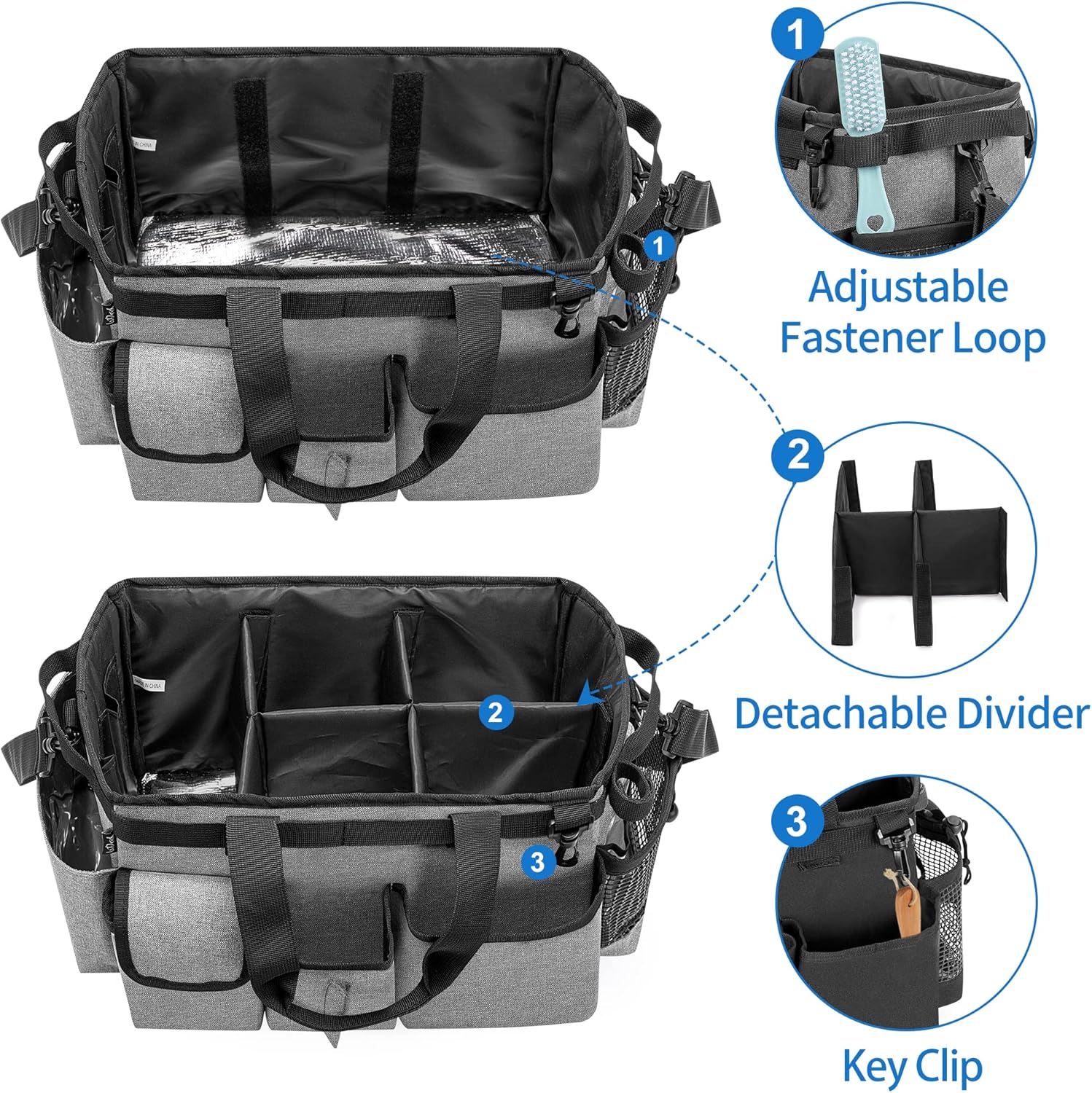 LoDrid Large Wearable Cleaning Caddy Bag with Detachable Divider, Cleaning Organizer with Handles, Cleaning Supply Tote with Adjustable Shoulder Strap for Cleaners & Housekeepers, Grey