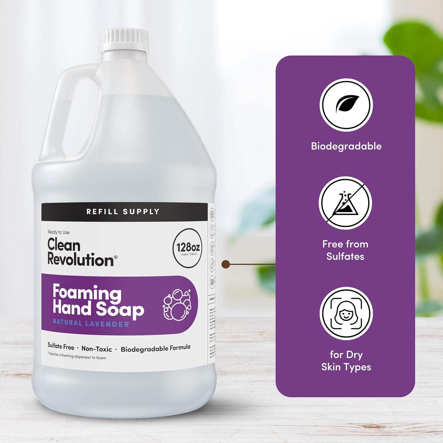 - REFILL & REUSE: Our Refill Supply container delivers exceptional value with 128 ounces of ready to use liquid foam soap designed to be used with Clean Revolution Refillable Foaming Hand Soap dispenser. A gallon jug has more than 8 refills, eliminating the need for individual single-use bottles and creating less plastic waste. Foaming Hand Soap dispenser sold separately.