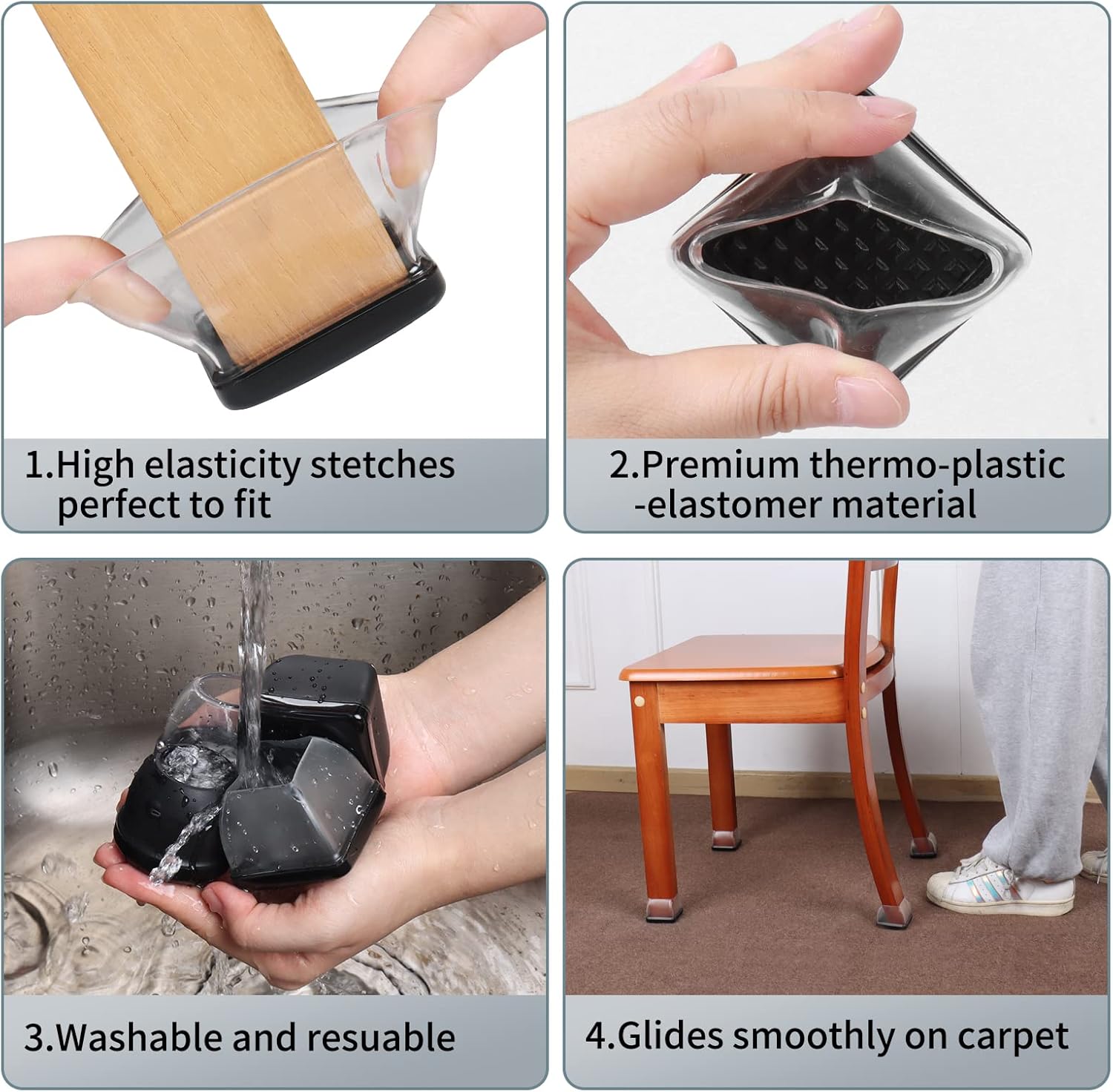 - ☛【Easy To Install & Reusable】- Just simply stretch and put them on. Table leg protectors for hardwood floor are easy to install for anyone who has some grip strength. Chair Feet Protectors Caps for carpet is easy to clean, It can be reused.