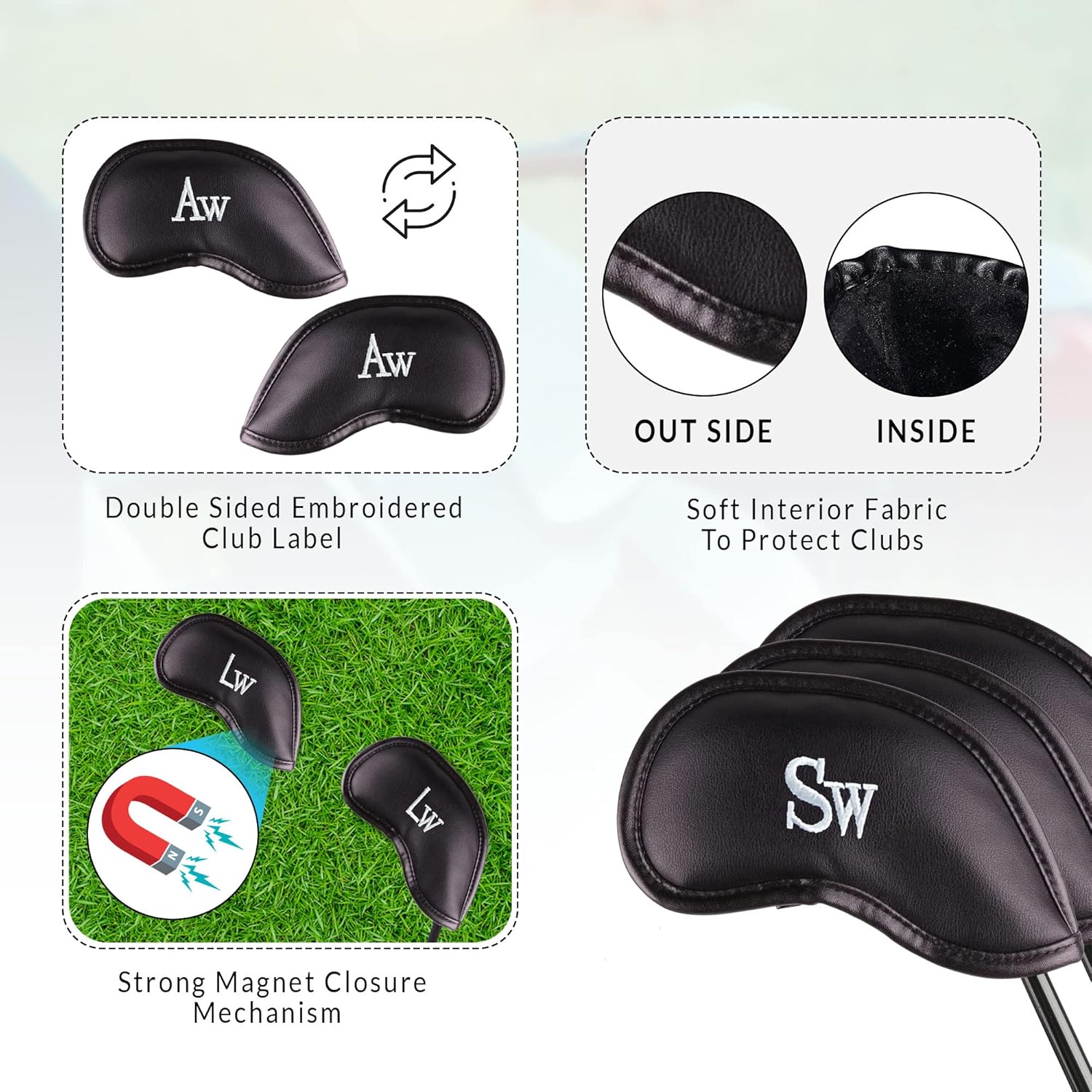 - Strong Magnetic Closure: The golf club headcovers are designed with magnetic closures that make sure the protective covers stay securely on your clubs. The leather iron head covers can easily be removed between shots