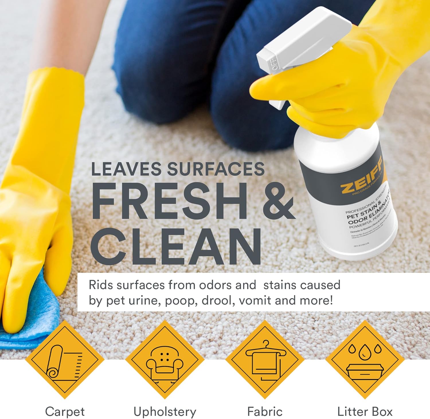 - ELIMINATES ODORS, & STAINS – Zeiff carpet cleaner for pets gets rid of stains and stink, eating through organic matter such as dog urine, cat pee, feces, vomit, blood, and drool. Our premium pet carpet cleaner is available in a quart spray bottle or gallon size.