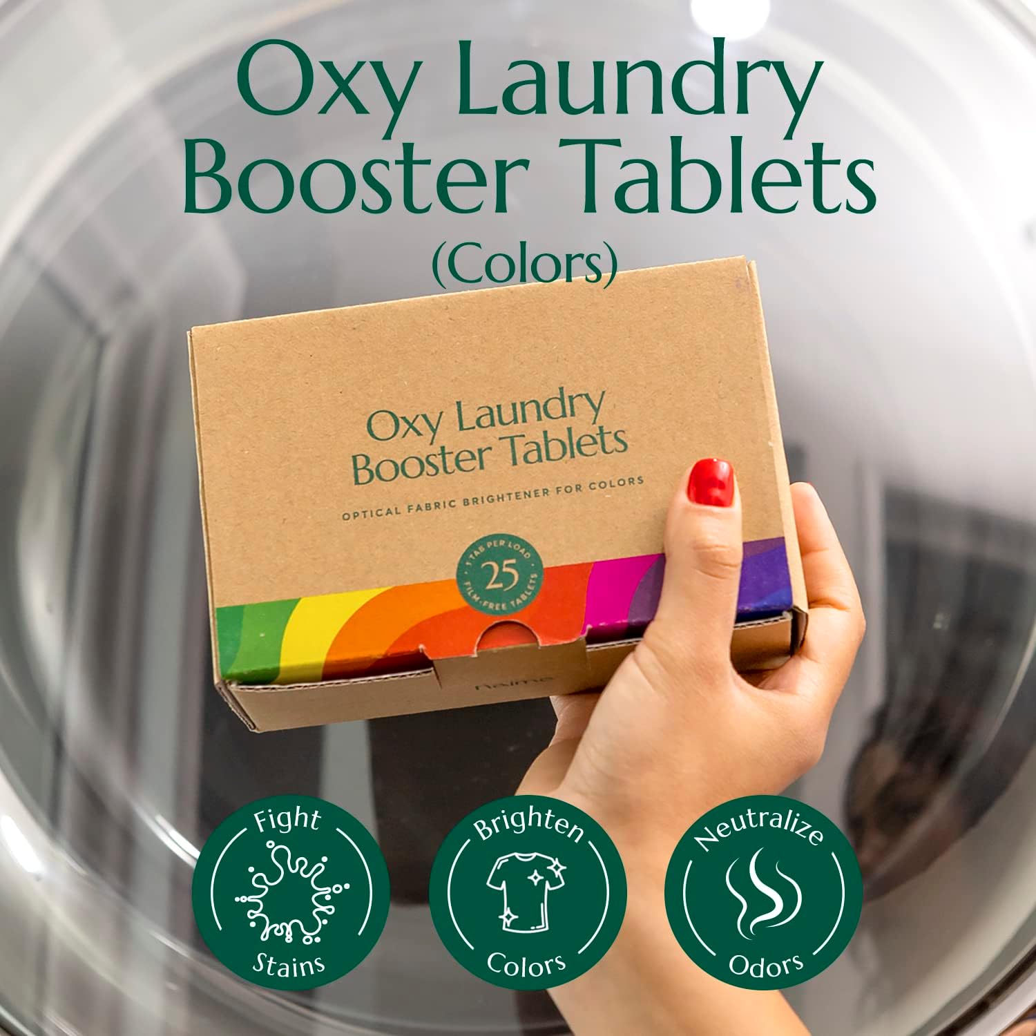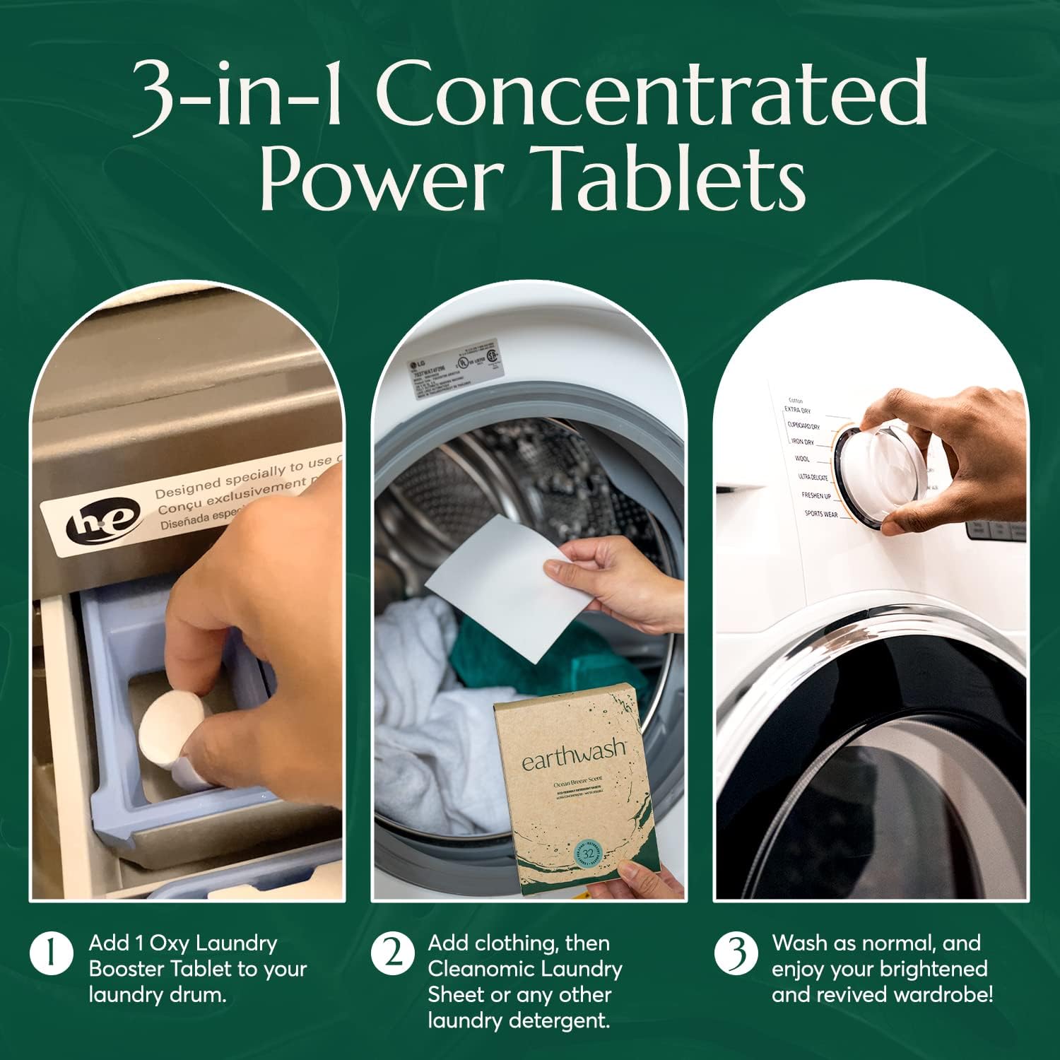 - First, add one Oxy Laundry Booster Tablet into your washer, then add clothes and Earthwash or your favorite detergent. Finally, wash as normal and enjoy your revived and brightened wardrobe with our laundry whitener brightener!