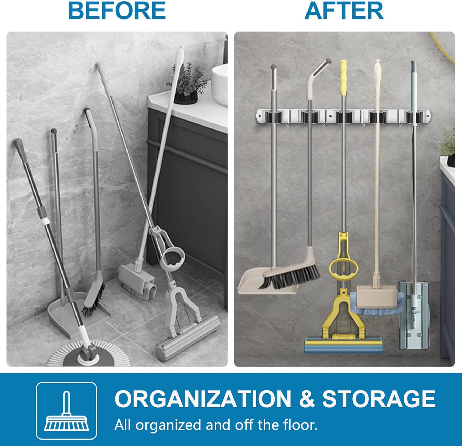 - HEAVY DUTY: Mop holder grip everything tightly and securely without slip. It can hold up to about 9 tools in total. Keep your place cleaned up and keep things organized