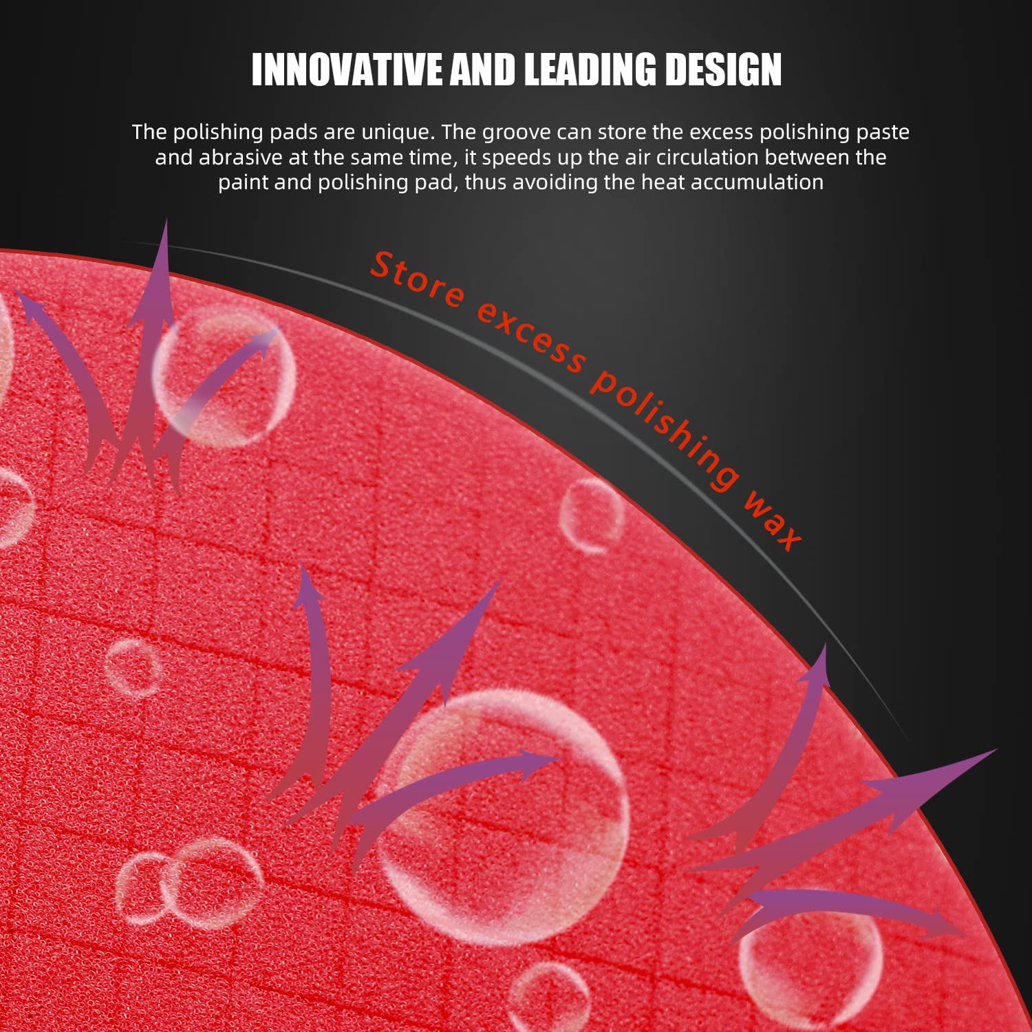 - [Innovative design] The groove can store excess polishing paste and abrasives; at the same time, it speeds up the air circulation between the paint and the polishing pad and avoids the accumulation of heat;