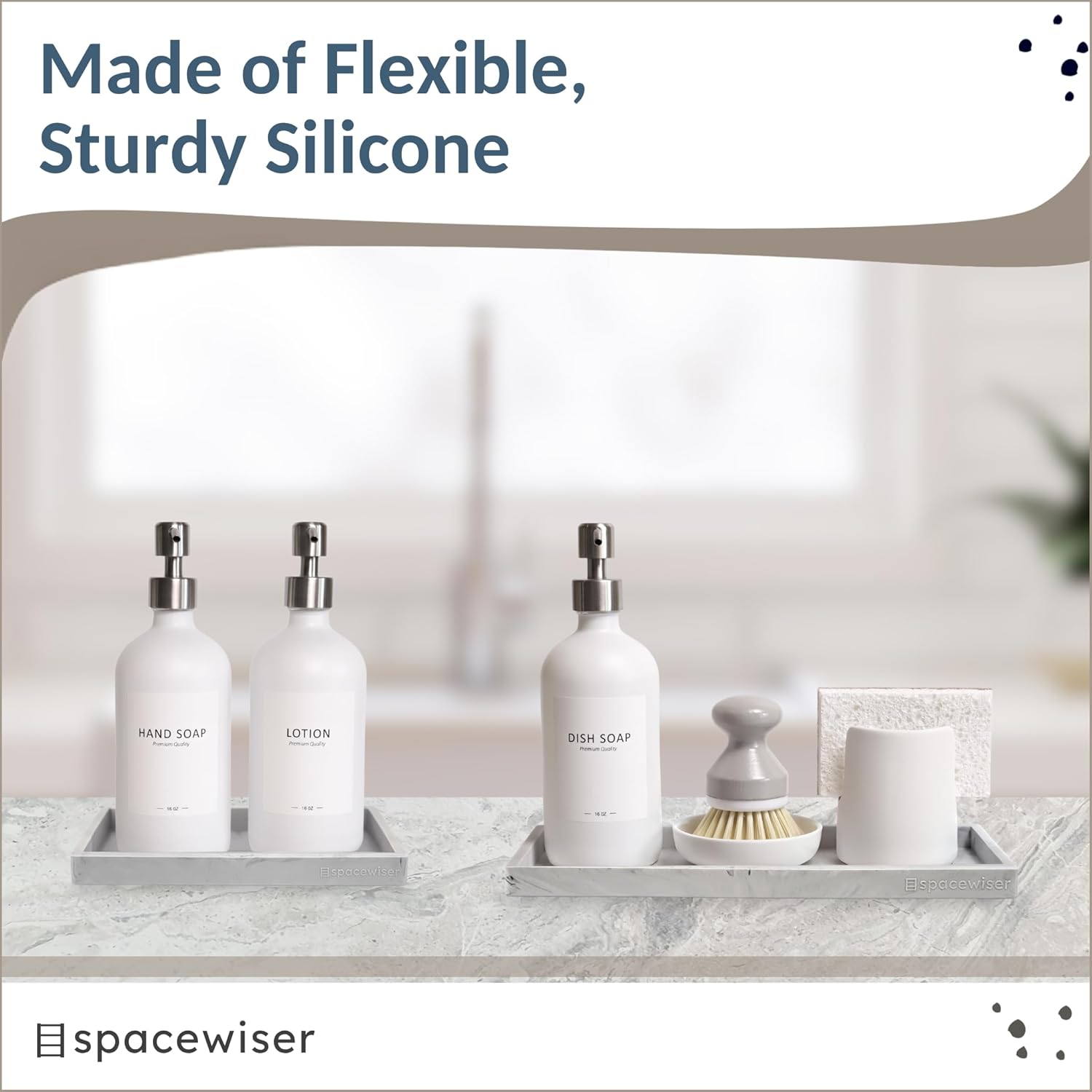 - Use Them Anywhere – Choose the endlessly useful and aesthetically pleasing trays that work anywhere. Spacewiser Original Silicone Trays work perfectly as a bathroom tray, vanity tray or kitchen sink tray. Spacewiser trays are made of premium food grade silicone, without the addition of potentially unsafe thickening and hardening agents or chemicals. They’re shatterproof, waterproof, slip-resistant, heat resistant to 425F, and dishwasher safe.