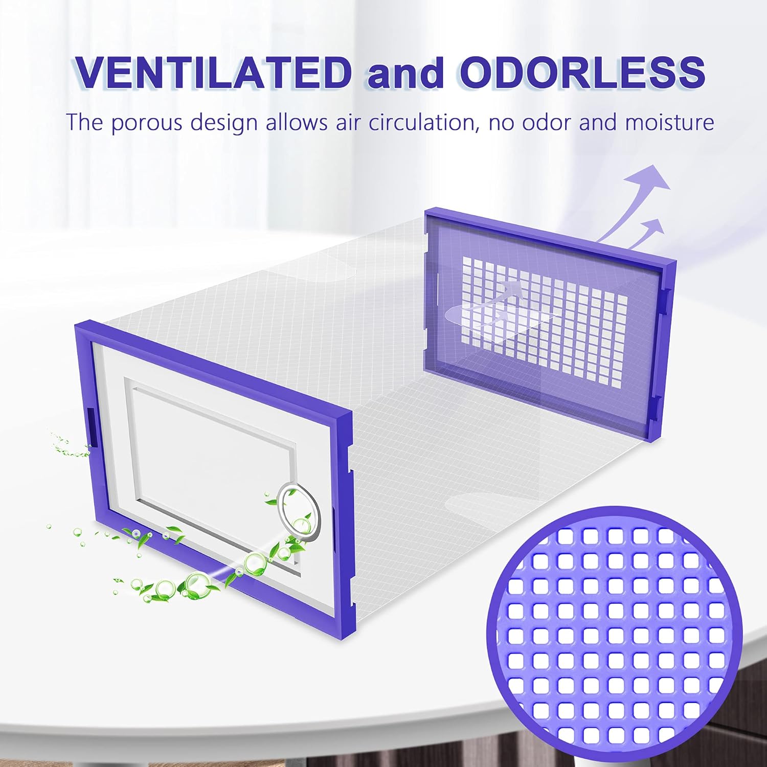 - Stackable shoe boxes connect together securely for compact storage; ventilation holes allow airflow to prevent odors