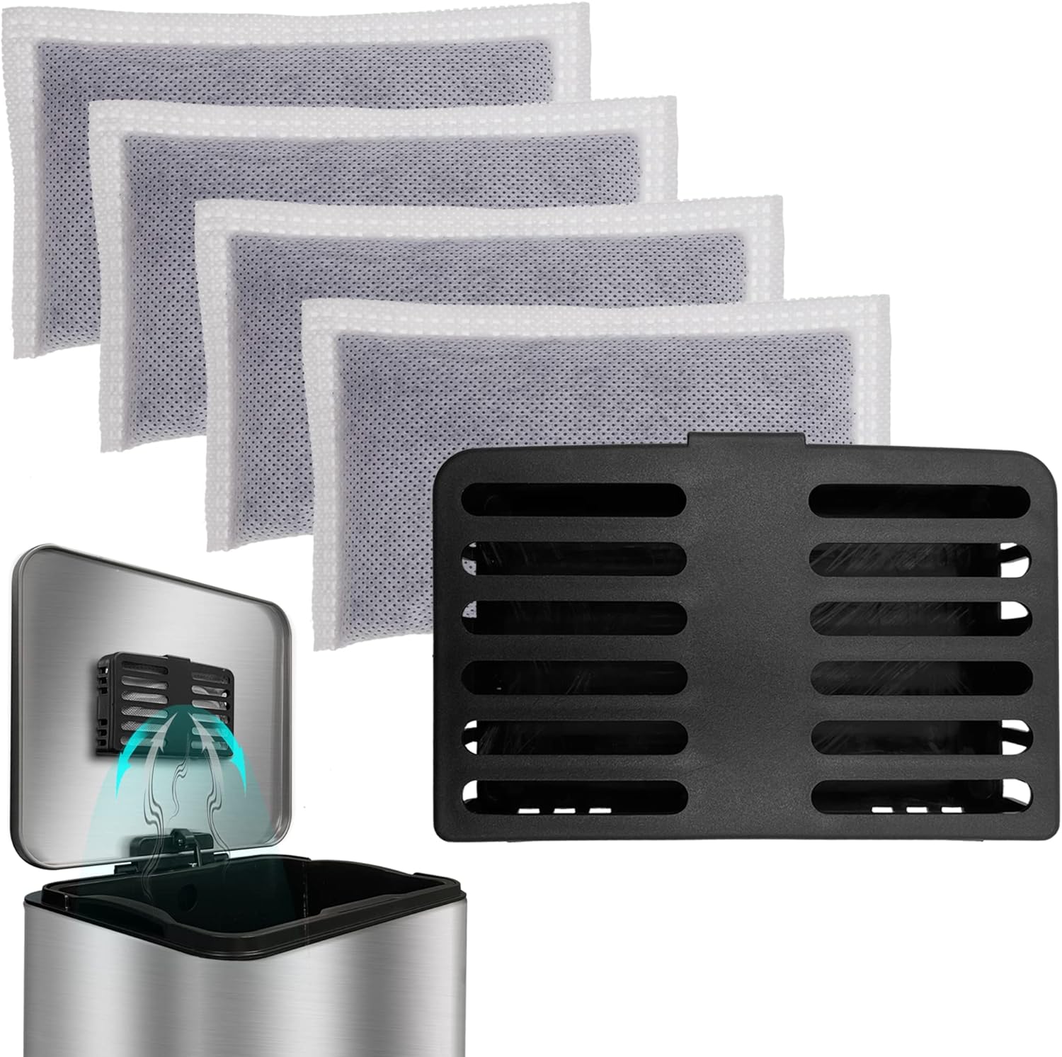 Activated Charcoal Odor Absorbing Filter Refill Deodorizer Compatible with iTouchless Trash Cans 8 Gallon and Larger (4 Large Filters+ 1 Compartment) (Black)