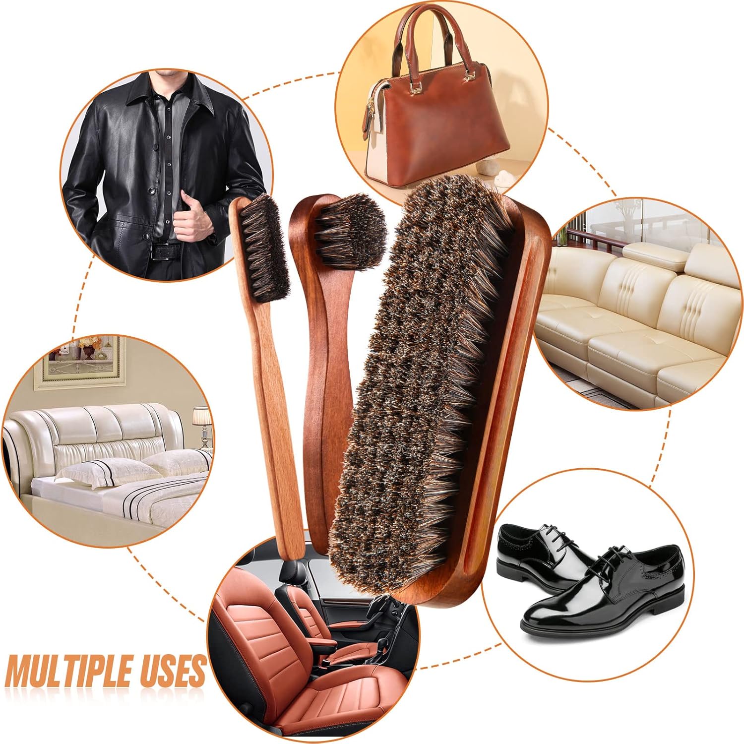 • Mufti-functional shoes brush set - This set contains 1 pieces shoes brushes, 2 piece long handle shoe cream brush, 1 piece detailing shoe brush and 1 piece shoes shine cloth with storage bag, suitable for shoes, handbags, luggage, boots, gloves, jacket, coat, car auto upholstery