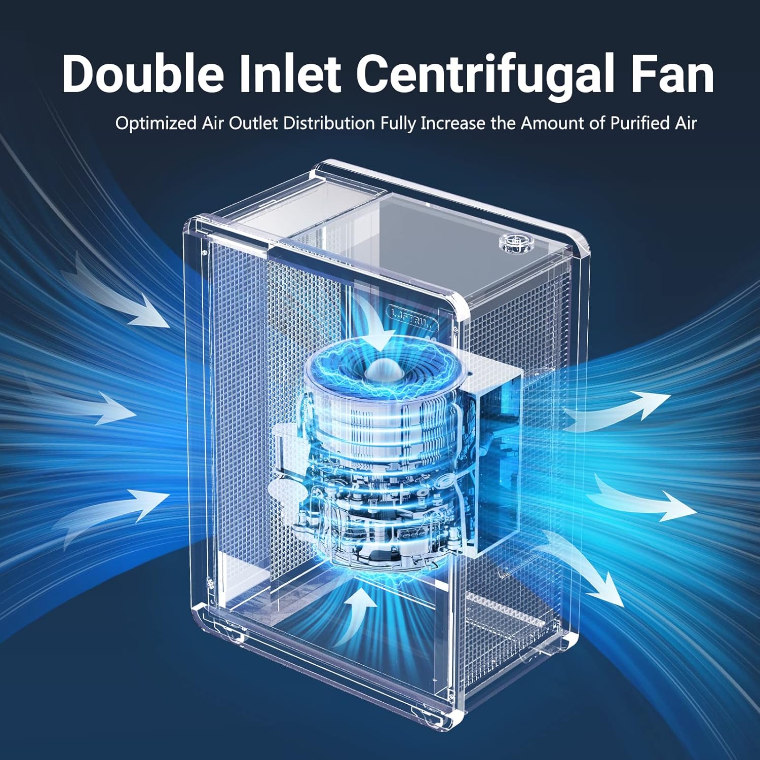 - High Performance: Home air purifier can enjoy fresh air in 11 minutes. The forward-inclined double-inlet centrifugal fan is used to pressurize the air at a high speed, fully increase the purification air volume, and improve the efficiency of air purification