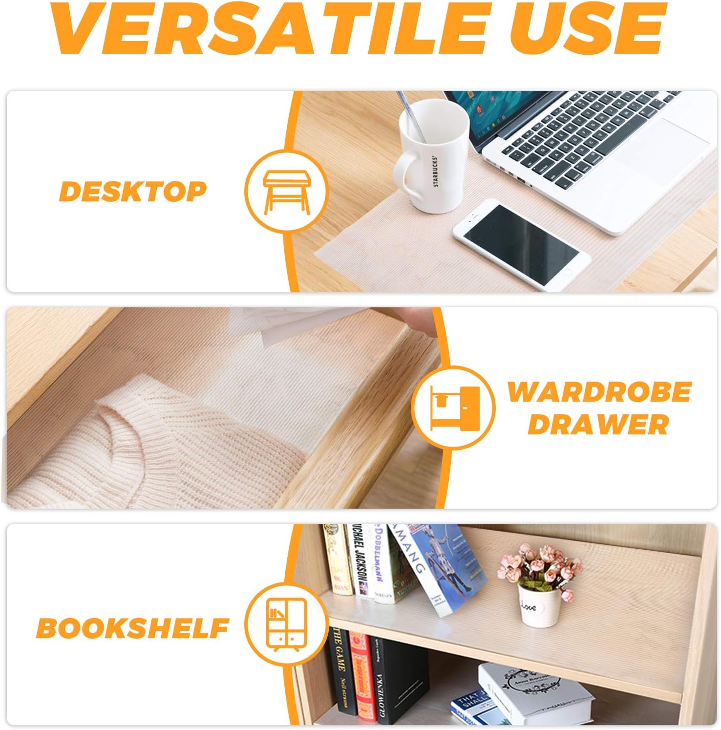 - π PERFECT STORAGE SOLUTION- These shelf liner come in 12" x 20 ft. Made of eco-friendly EVA material and feature a non-slip design, the shelf liners for kitchen cabinets help prevent spillage by keeping your items locked into place and free from unwanted dirt and debris. The plastic drawer liners for dresser is ideal for use in a top drawer, bedroom dresser, bathroom cabinets, kitchen cabinets and desk drawers for organizing and protecting small items from damage or scratches.