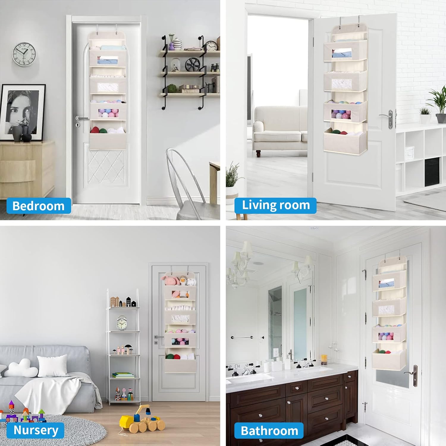 MAX Houser 4-Shelf Over The Door Hanging Organizer with 2 Metal Hooks, 4 Pocket Swing-Proof Behind Door Organizers with Clear Windows for Nursery Bathroom Closet,Dorm,Baby Diapers, Kids Toys (Beige)