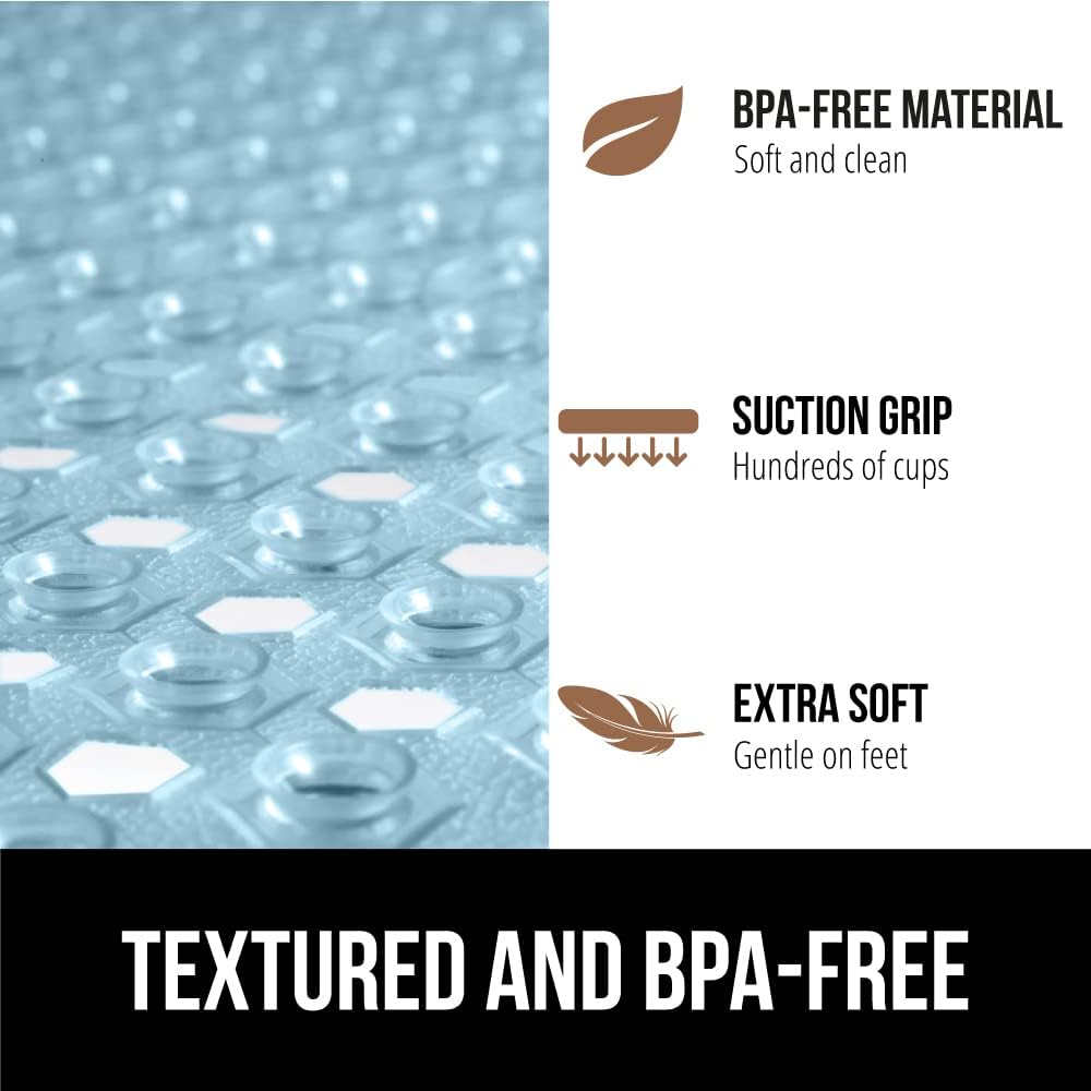 - TEXTURED AND BPA-FREE: the mat is constructed from BPA free materials; it features a unique hexagon design with a pebble textured topside that is soft on feet; shower mat is soft, flexible, and perfect for the whole family