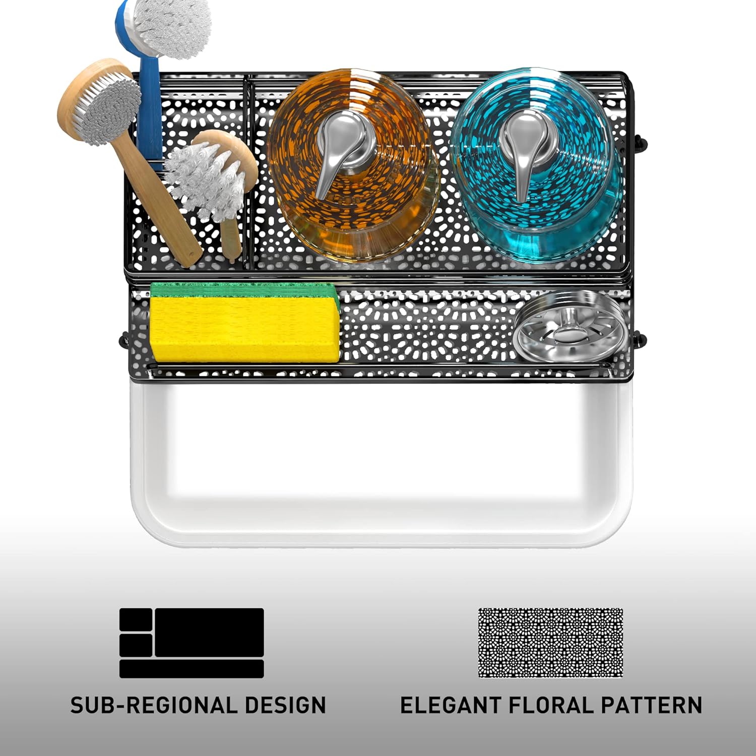 - ăREASONABLE DIVIDER DESIGNă The sponge holder for kitchen sink ergonomic divider design allows it to have 4 separate storage spaces, Different items are placed in different areas, so as to achieve a well-organized effect, so that your counter is no longer cluttered.