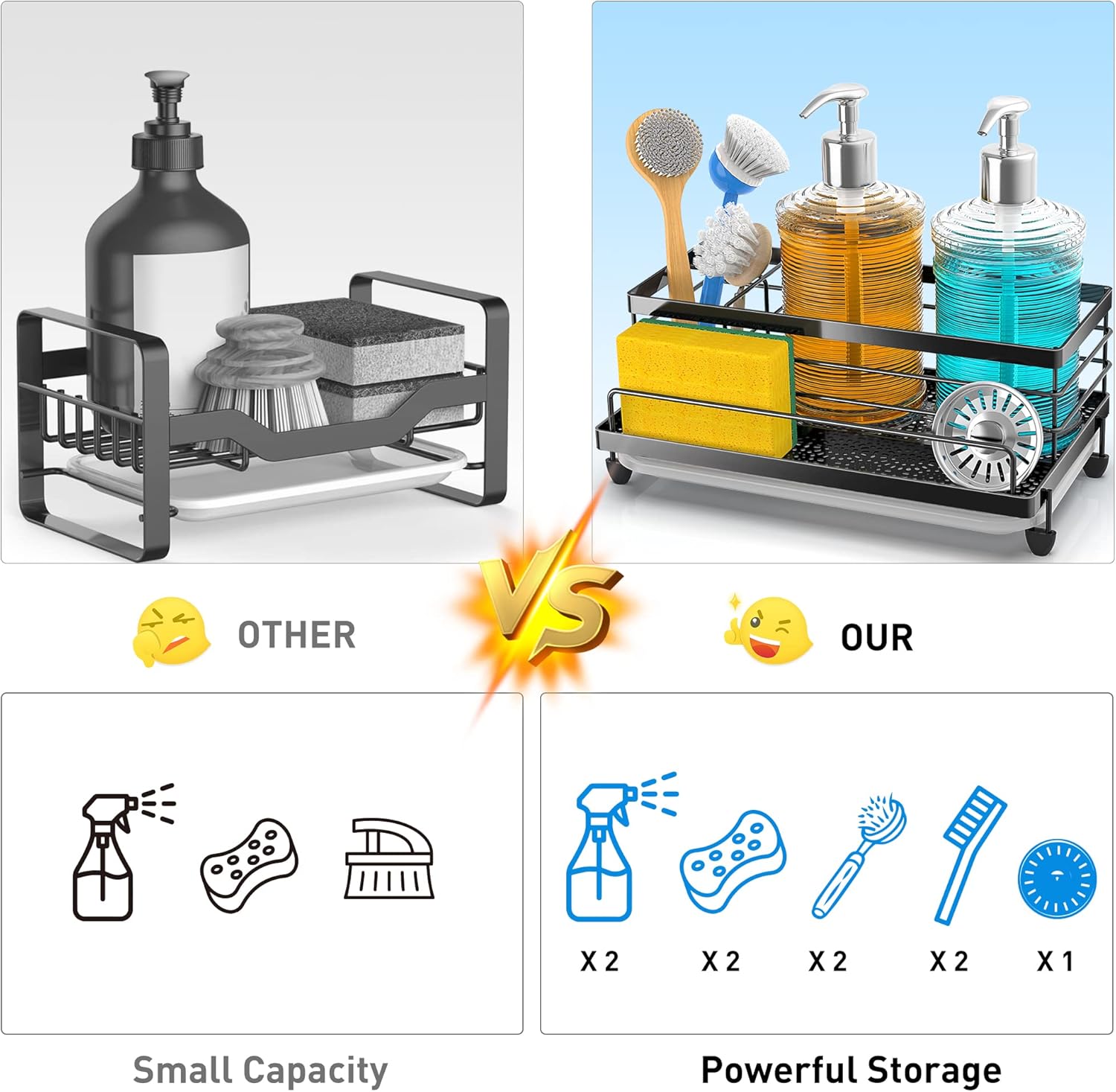 - ăMORE STORAGE SPACE ăCompared to other kitchen sink caddy CISILY sponge holder expands to 5.3 inches wide and 9.49 inches long, enhancing its kitchen organization function, and allowing flexible placement of sponges, dish soap, soap dispensers, brushes, sink plugs and more. Make the most of every inch of space and make your kitchen look cleaner.