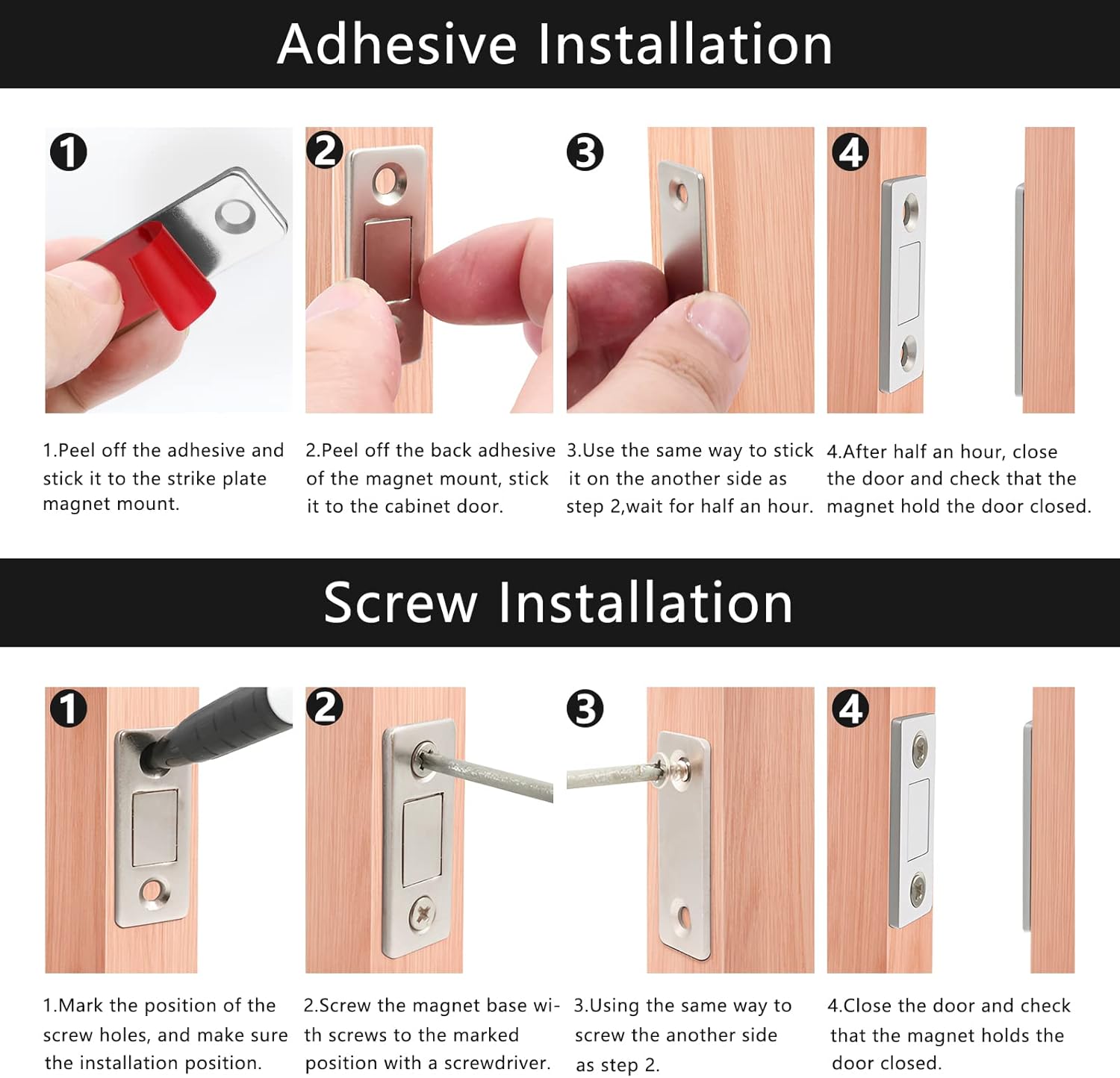 • Easy to Install: There are two ways to install: using strong adhesive sticker or screws mounting, which are both easy to install for you and keep the cabinet or door to stay shut without damage. You can choose the way according to what you want
