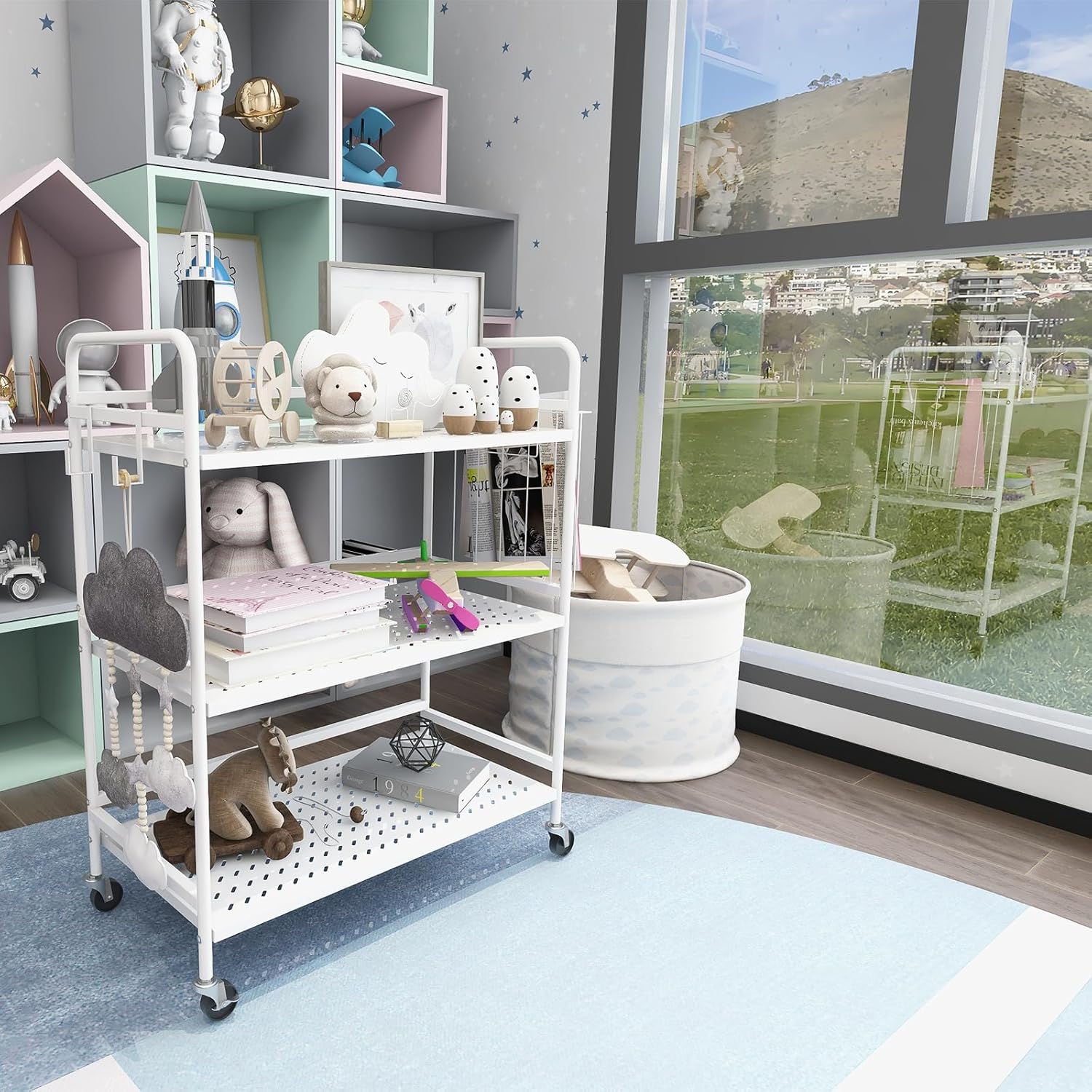 HDANI 3 Tier Metal Mesh Utility Cart,Large Capacity Multipurpose Heavy Vehicle,Rolling Trolley with to Hooks and One Basket(White)