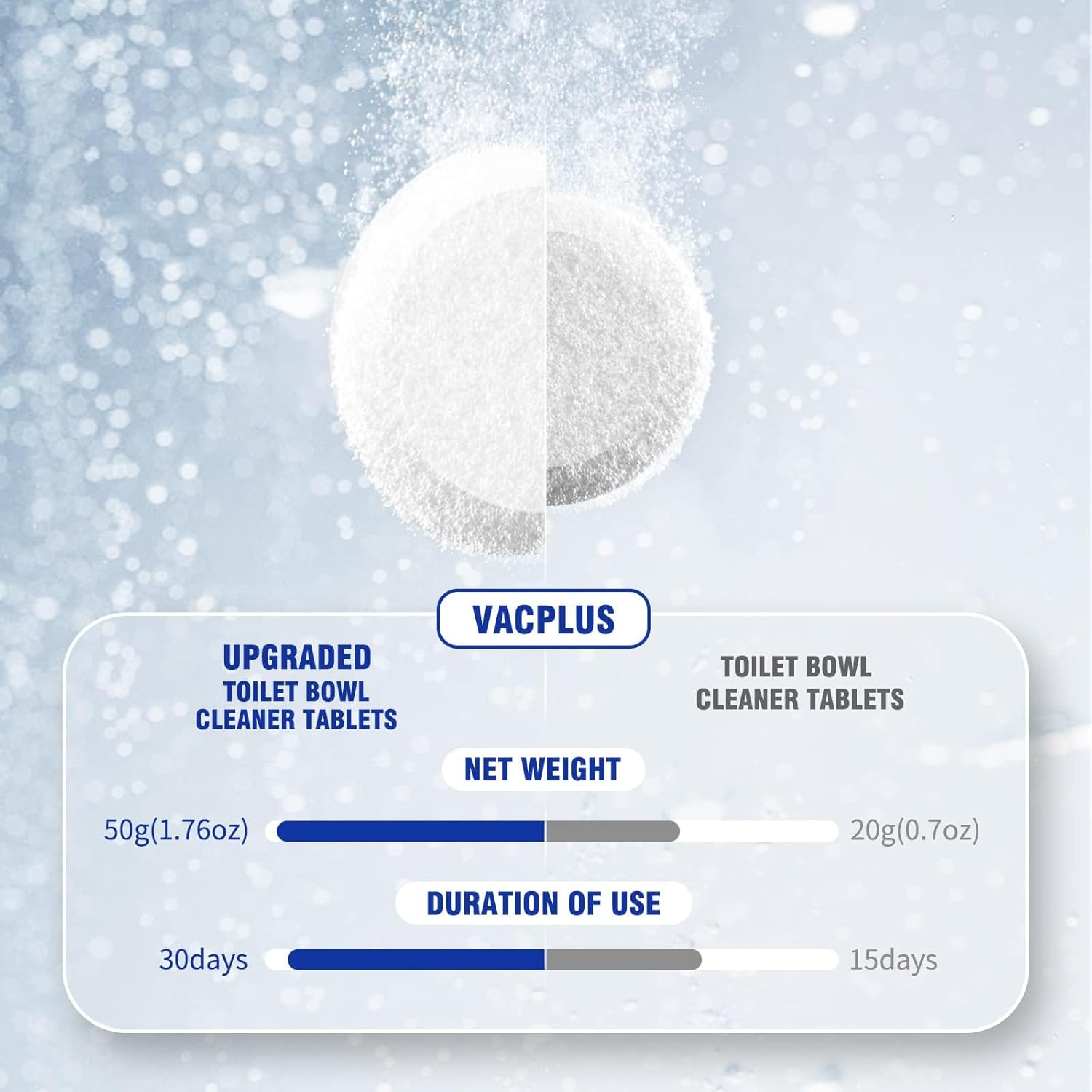 - LASTINGLY CLEAN: With an upgraded capacity of 50g each, a Vacplus toilet cleaner with bleach continuously cleans the toilet for up to 30 days. With 12 packs for replacement use, Vacplus toilet tablets can keep the toilet bowl fresh for more than 12 months.