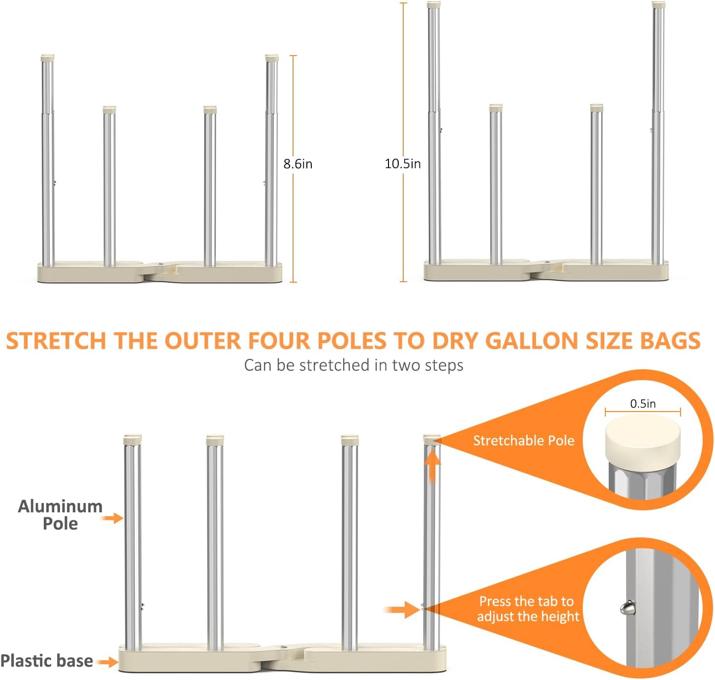 - ăLarge SizeăThis reusable bag drying rack can be stretched to 10 inch high to dry gallon sized reusable bags and tall water bottles, it can hold 4 reusable bags and 8 bottles or cups maximum.