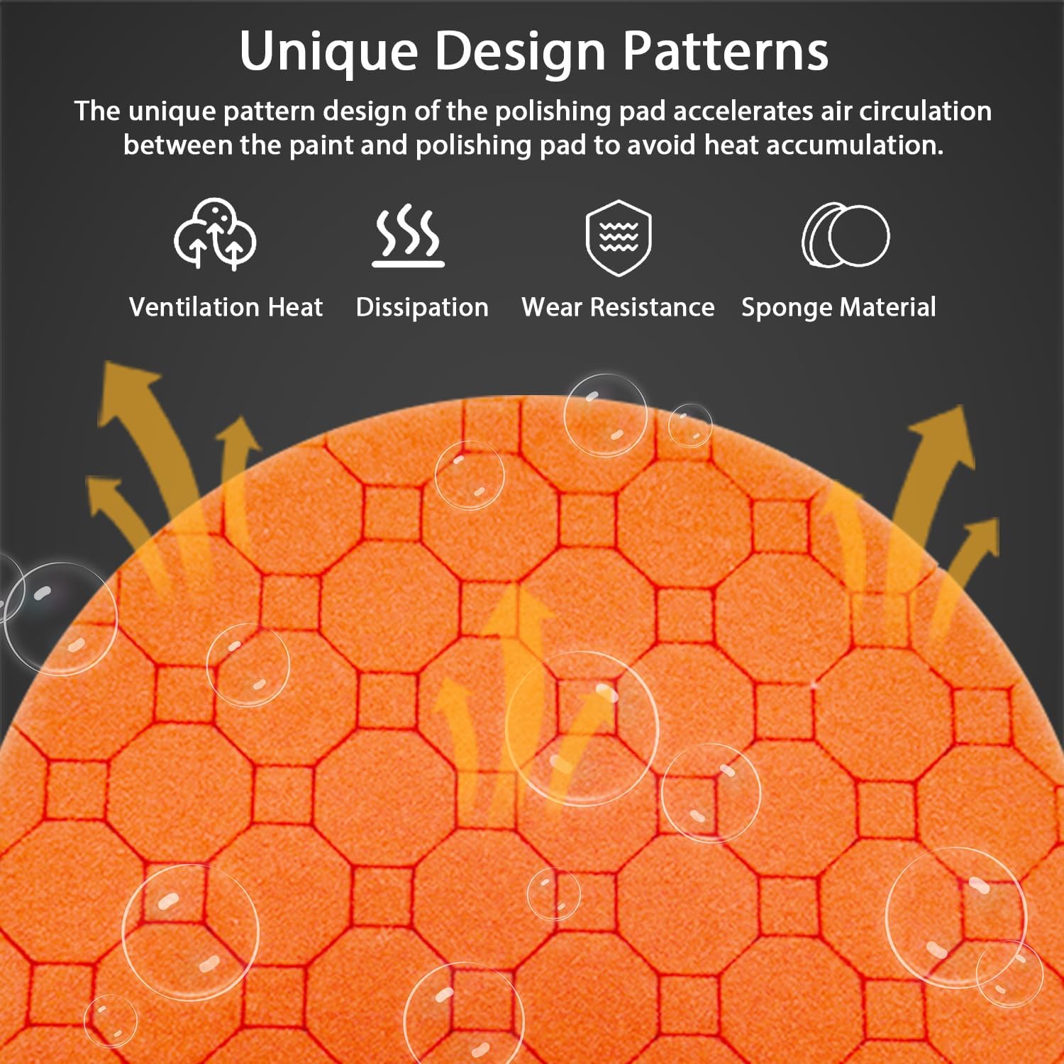 - The polishing pad has different sizes on both sides - 5.5"/140mm on the front and 5"/125mm on the back. The unique honeycomb pattern design on the surface can protect the surface from scratches during polishing, reduce the wear of the polishing pad itself, improve the airflow between the pad and the surface, and also have the function of heat dissipation.