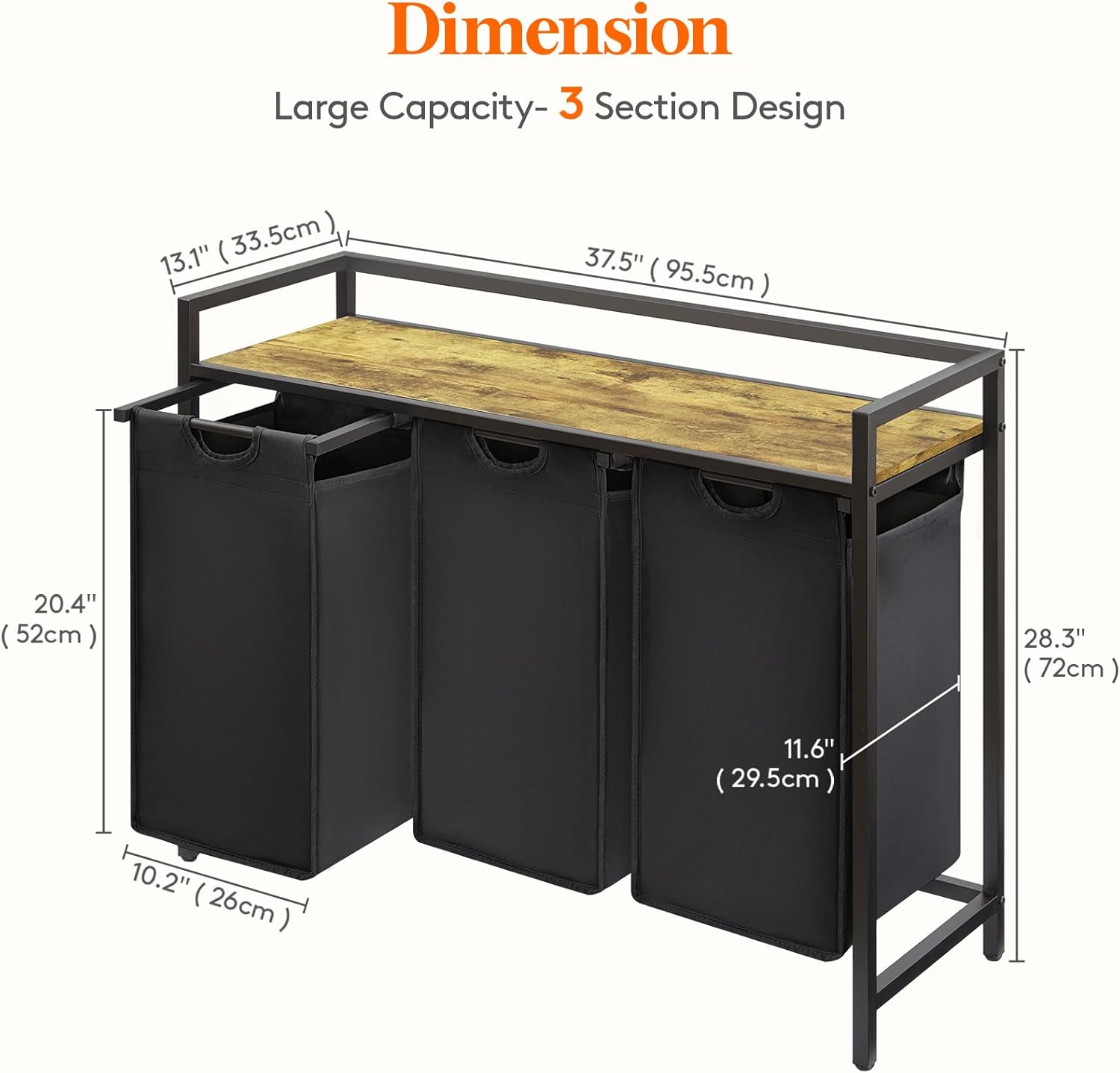 - 120L Storage Space: The laundry hamper measures 37.5" (95cm) ×13.7" (35cm) ×28.3" (72cm), while each of its three laundry bags measures 10.2" (26cm) ×11.4" (29cm) ×20.4" (52cm). It is designed to accommodate up to 40L of laundry per bag, providing a total of 120L of storage space. With this laundry sorter, you can categorize your garments based on color and fabric type and maintain a clutter-free laundry area.
