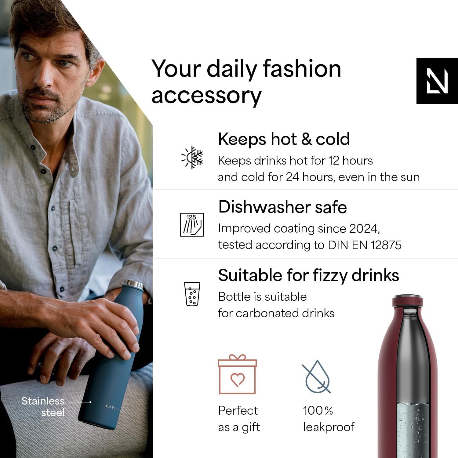 - THERMAL BOTTLE WITH VACUUM INSULATION 12H HOT/24H COLD: The water bottle has a double-wall vacuum insulation and keeps drinks up to 12h hot and 24h cold. Perfect for cold and hot drinks on the go like coffee or tea.
