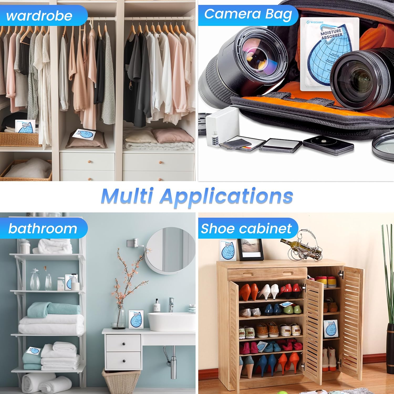 - 【Space-Saving】: Wisesorb moisture absorber bags are designed to save space, making them incredibly easy to use. Simply place them in the desired area without occupying much space. Placing them paper side up as instructed to observe the beads turning into gel, offering a visual confirmation of moisture absorption. The result is preserved crispness in clothes and the elimination of musty odors, making Wisesorb bags a reliable choice.