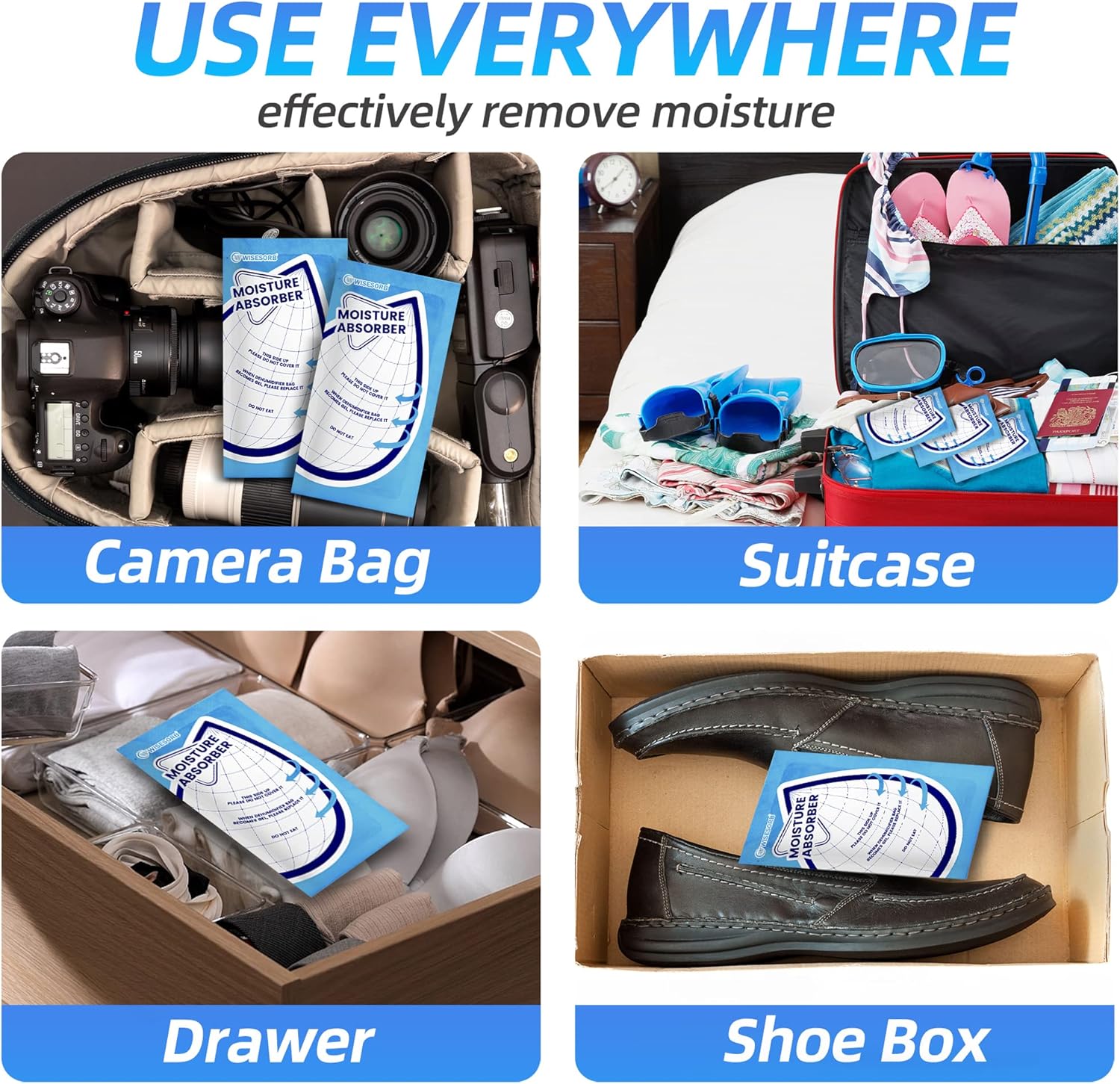 - 【Versatile Usage】: Moisture absorber packets can be used in various locations, including closets, wardrobes, basements, laundry rooms, households, bathrooms, kitchens, shoe cabinets, cars, cat litter boxes, toolboxes, RVs, campers, and other enclosed spaces. These moisture absorber bags effectively protect your valuables from damage caused by excess moisture and prevent smells. Remember to keep the paper side facing up for optimal performance.