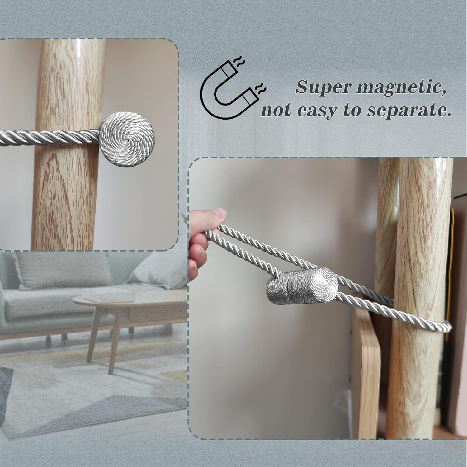 - [Upgrade Powerful Magnetic] Our magnetic curtain tiebacks magnets use high-end new imported nickel-plated magnets, with strong corrosion resistance and durability, more magnetic than ordinary magnetic curtain tiebacks, and do not rust and not lose color. The rope of curtain tie adopts upgrade thickened solid polyester yarn, which is not only durable, but also not easy to wear or pilling.