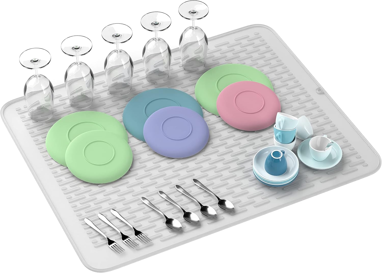 - 100% silicone heat resistant kitchen drying mat is eco-friendly, BPA free and dishwasher safe. It is superior to a dish drying pad because it is waterproof, easy to clean and sanitary.