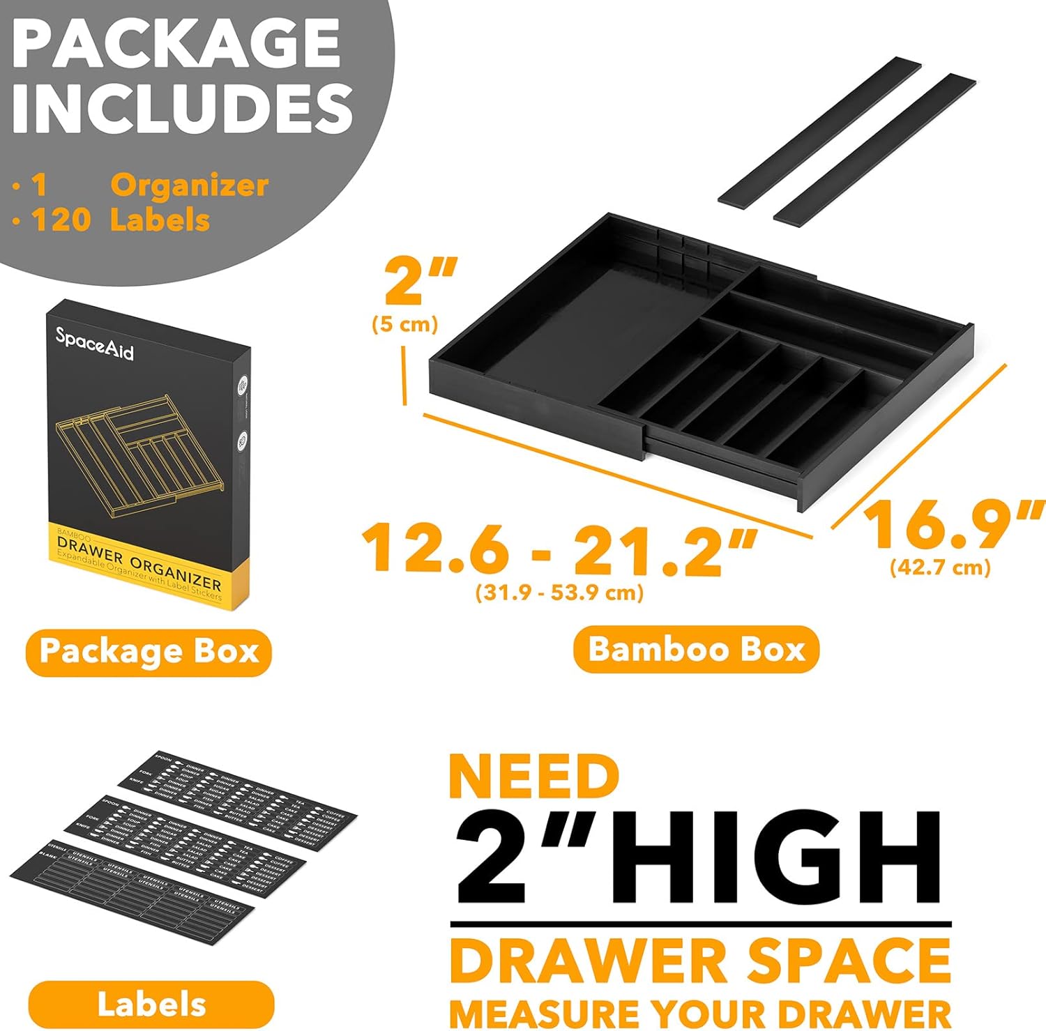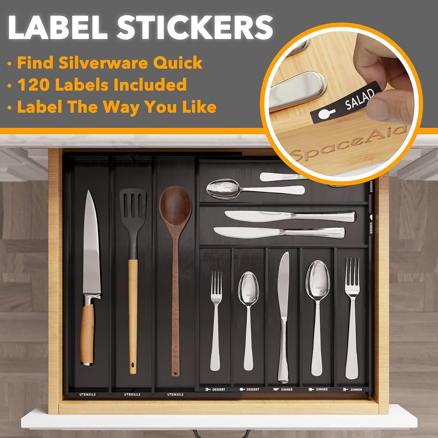 SpaceAid Bamboo Silverware Drawer Organizer with Labels, Kitchen Utensil Expandable Tray Holder Organizer for Flatware, Cutlery, Spoon and Knives Drawer Storage Organization (Black, 10 Slots)