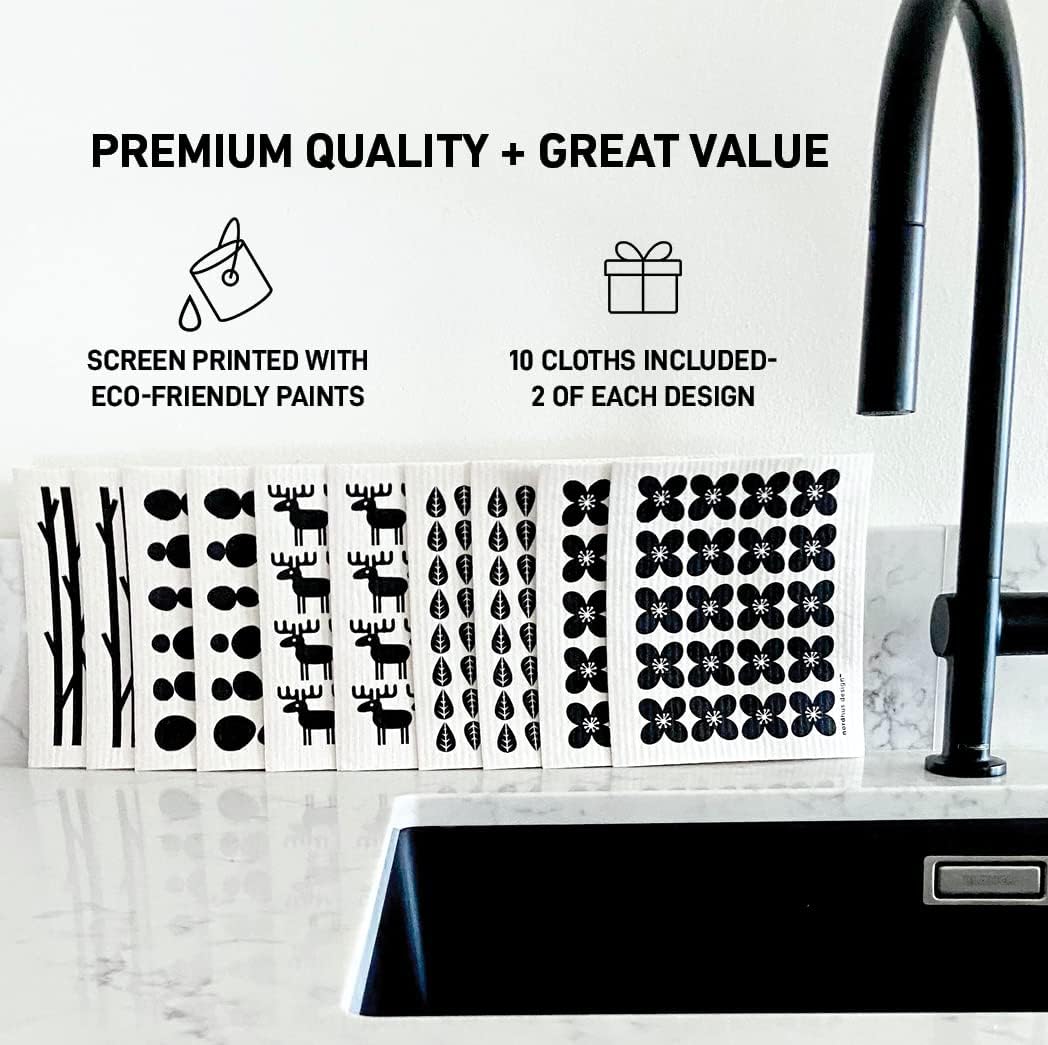 - Eco-Chic Packaging - Our black and white Swedish dishcloths come in a charming 100% compostable package. Perfect for housewarming events, birthdays or holidays, this Swedish dishcloth set thoughtfully combines elegance and practicality.