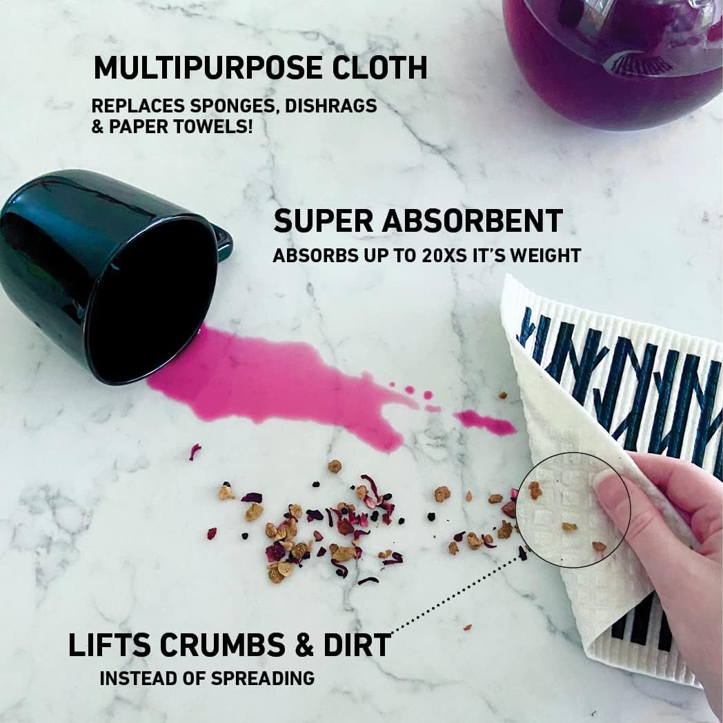 - Shockingly Absorbent cloths pick up water like a sponge. Each cleaning cloth absorbs more than half a cup of liquid before needing to be wrung out. They also pick up dry particles (like crumbs, flour, dust etc.) instead of spreading them around like other kitchen rags. Unlike sponges however their large flat composition makes them dry fast, avoid bad smells, and clean more- faster. Now you can up your game by using these Swedish dish towels for kitchen use or anywhere around the house (or car!)