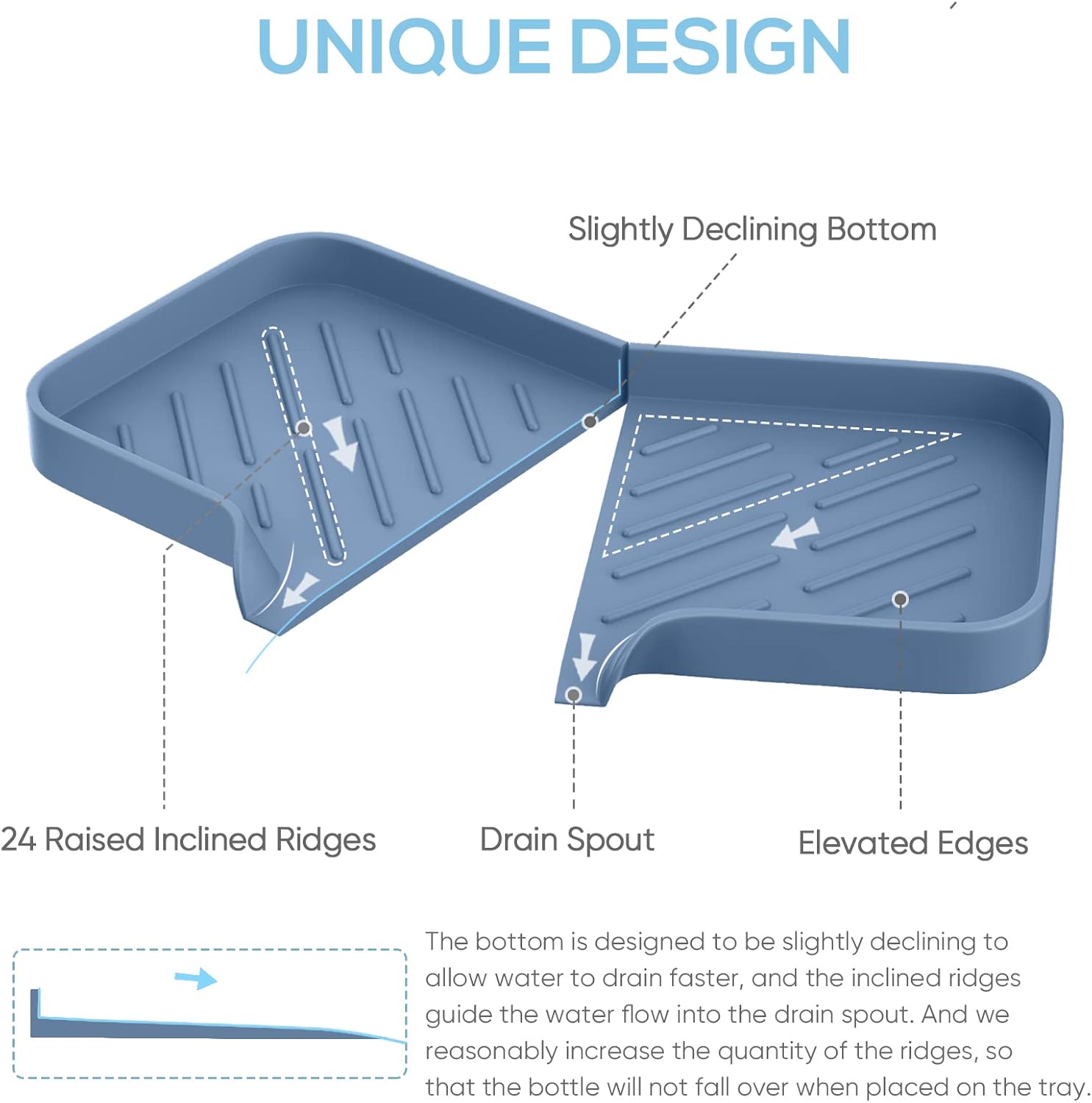 - New Upgraded Kitchen Soap Tray: After analyzing the advantages and disadvantages of many similar products, we made important upgrades in many details for our silicone kitchen sponge holder. The unique design and premium silicone material are suitable for any countertop, it helps keep the counters dry and organized. This silicone tray is non slip and easy to clean. The upgraded self-draining design will drain the water faster. Choosing us will bring more convenience to your life!