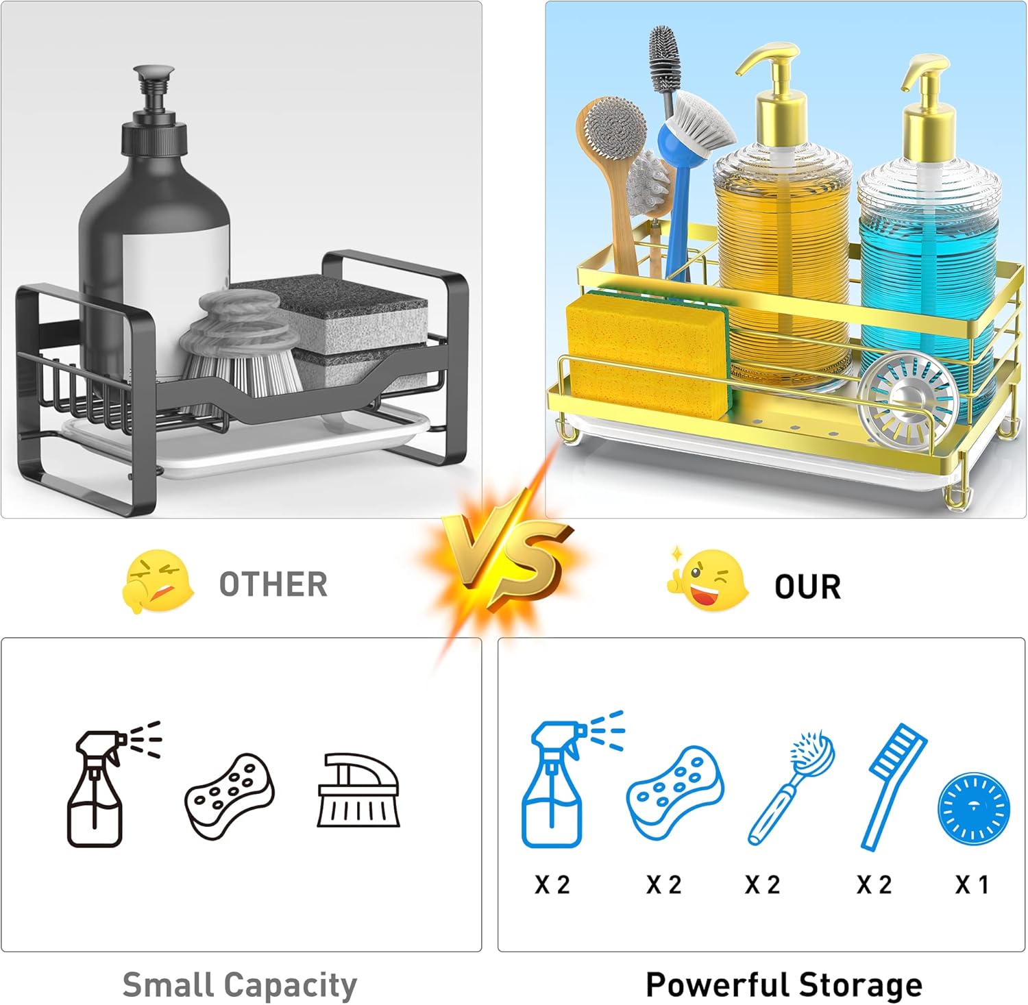 - 【MORE STORAGE SPACE 】Compared to other kitchen sink caddy CISILY sponge holder expands to 5.3 inches wide and 9.49 inches long, enhancing its kitchen organization function, and allowing flexible placement of sponges, dish soap, soap dispensers, brushes, sink plugs and more. Make the most of every inch of space and make your kitchen look cleaner.