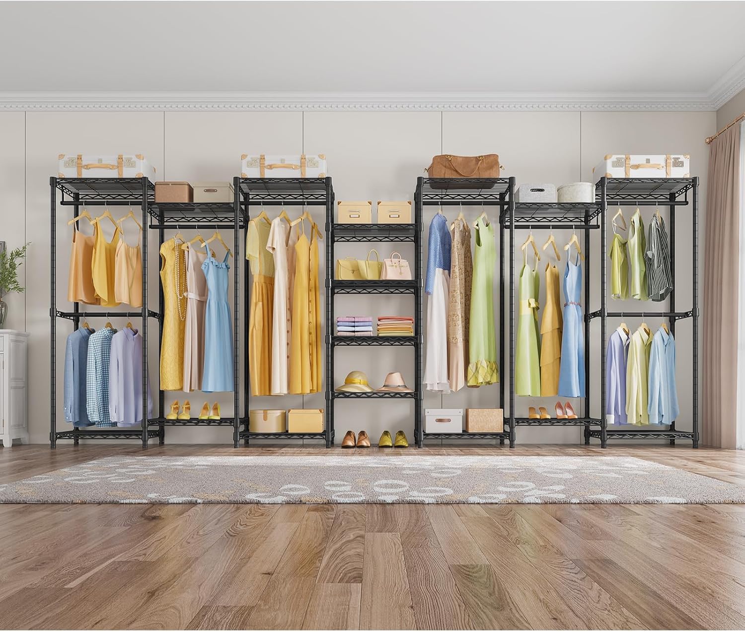 - Multifunction Closet Rack: 6 Tiers Closet Rack maximize the storage area, ensure you enough space to place your clothes, accessories, bedding, lining, shoes, etc. The 4 pcs clothes hanging rods hold up to 60 lbs for each, it is great for hanging suits, coats, long dresses, jackets, pants, shirts or other heavy clothes.