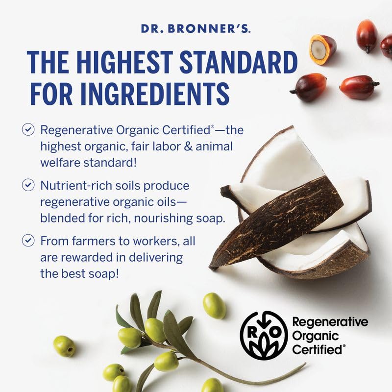 - MADE WITH ORGANIC OILS & CERTIFIED FAIR TRADE INGREDIENTS: Dr. Bronner's soap liquid is made with over 70% certified organic & fair trade ingredients, promoting healthy communities, ethical working conditions & fair prices. And now sourcing Regenerative Organic Certified coconut, palm kernel, and olive oil