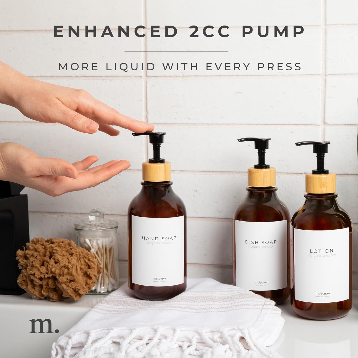 - Pack Includes: 3 extra-thick PET plastic shampoo bottles refillable with pump which can hold 16.9 fl oz/500ml; 6 waterproof marguax labels including hand soap, dish soap, lotion, shampoo, conditioner, body wash. The ideal bathroom accessories set for your home!