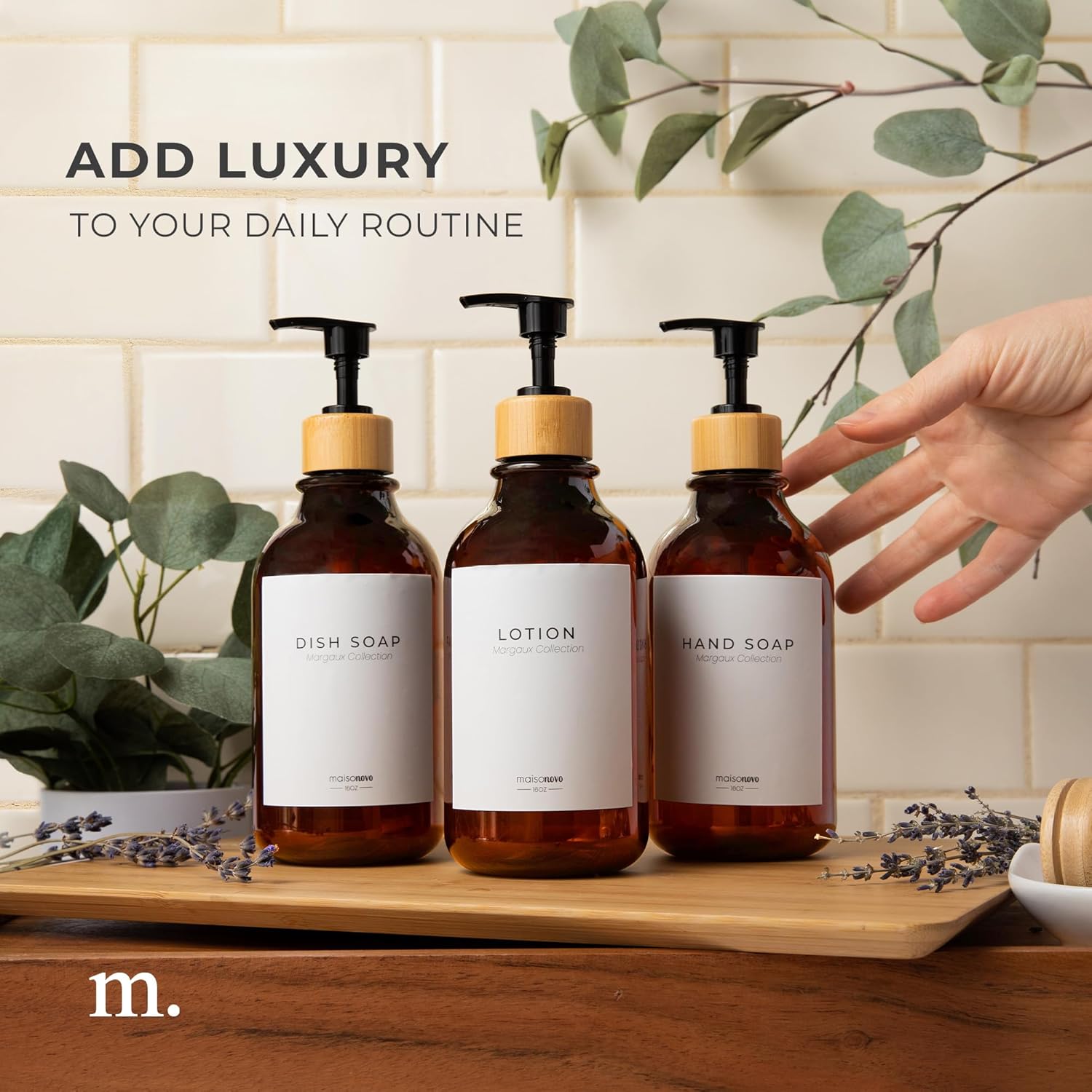 MaisoNovo Refillable Shampoo and Conditioner Bottles | 16.9 fl oz Set of 3 Amber Plastic Bottles Black Bamboo Pumps