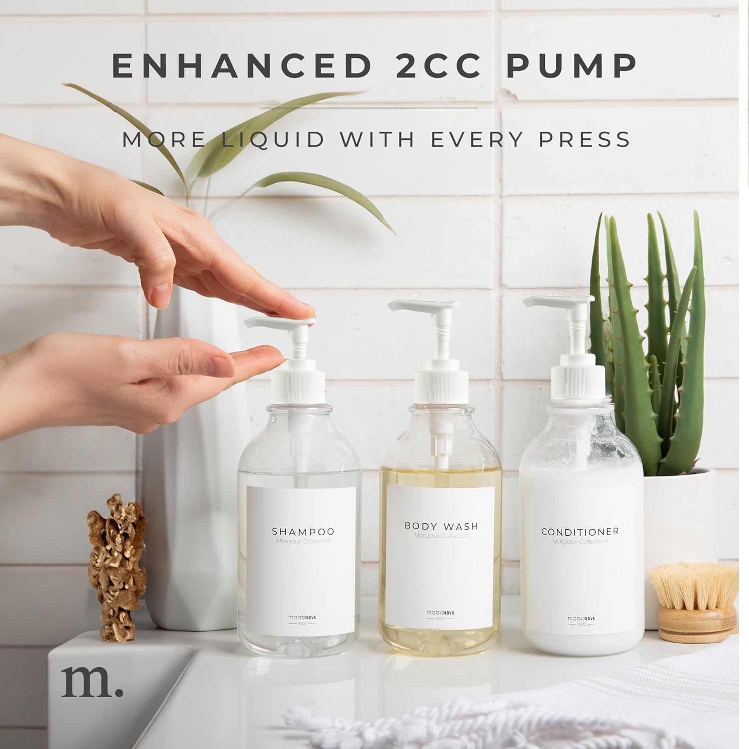 - Pack Includes: 3 extra-thick PET plastic shampoo bottles refillable with pump which can hold 16.9 fl oz/500ml; 6 waterproof marguax labels including hand soap, dish soap, lotion, shampoo, conditioner, body wash. The ideal bathroom accessories set for your home!