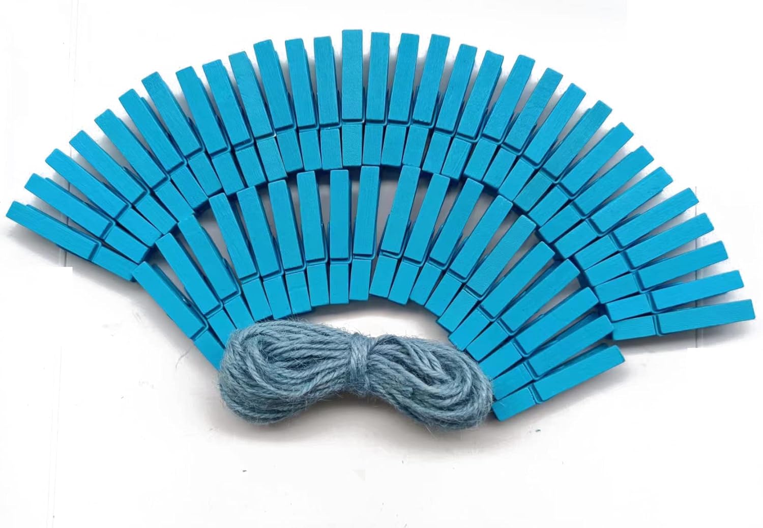 - Clothespins set: 50 pieces bright blue wooden clothes clips with 10 meters (33feet) bright blue jute twines to hang pictures or art craft Decor