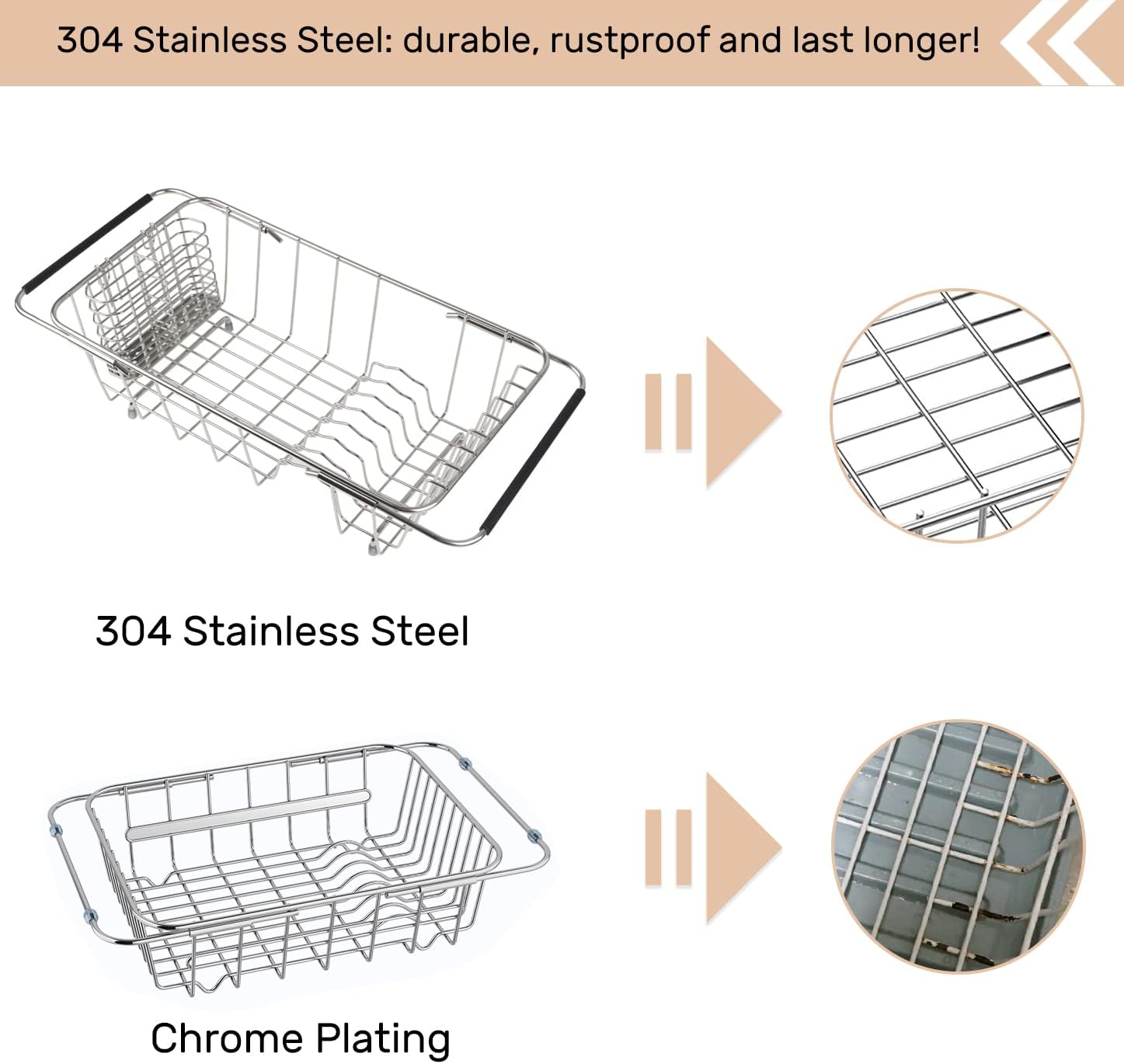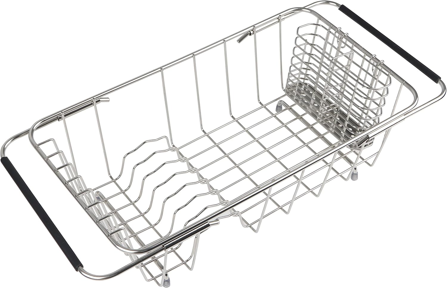 Sink Dish Drainer Rack, Expandable 304 Stainless Steel Dish Drying Rack Organizer with Stainless Steel Utensil Rack, Adjustable 14.96" to 20.59" Inside The Sink (up to 7 Upright Utensils).