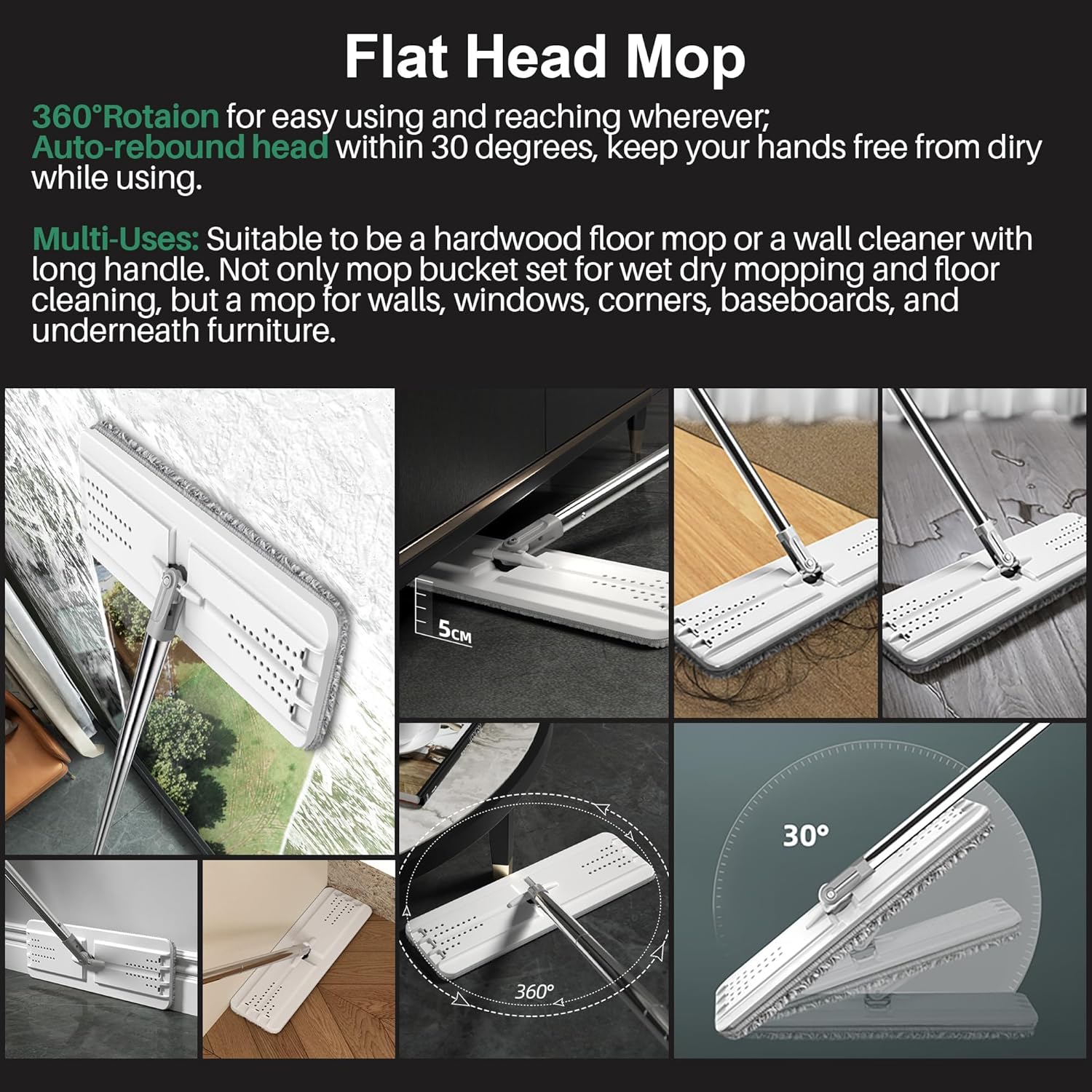- 360° Rotating Mop Head – Reaches corners, walls & tight spaces effortlessly. The adjustable stainless-steel handle extends from 26.5 to 50 inches, making mopping easier for everyone in the family