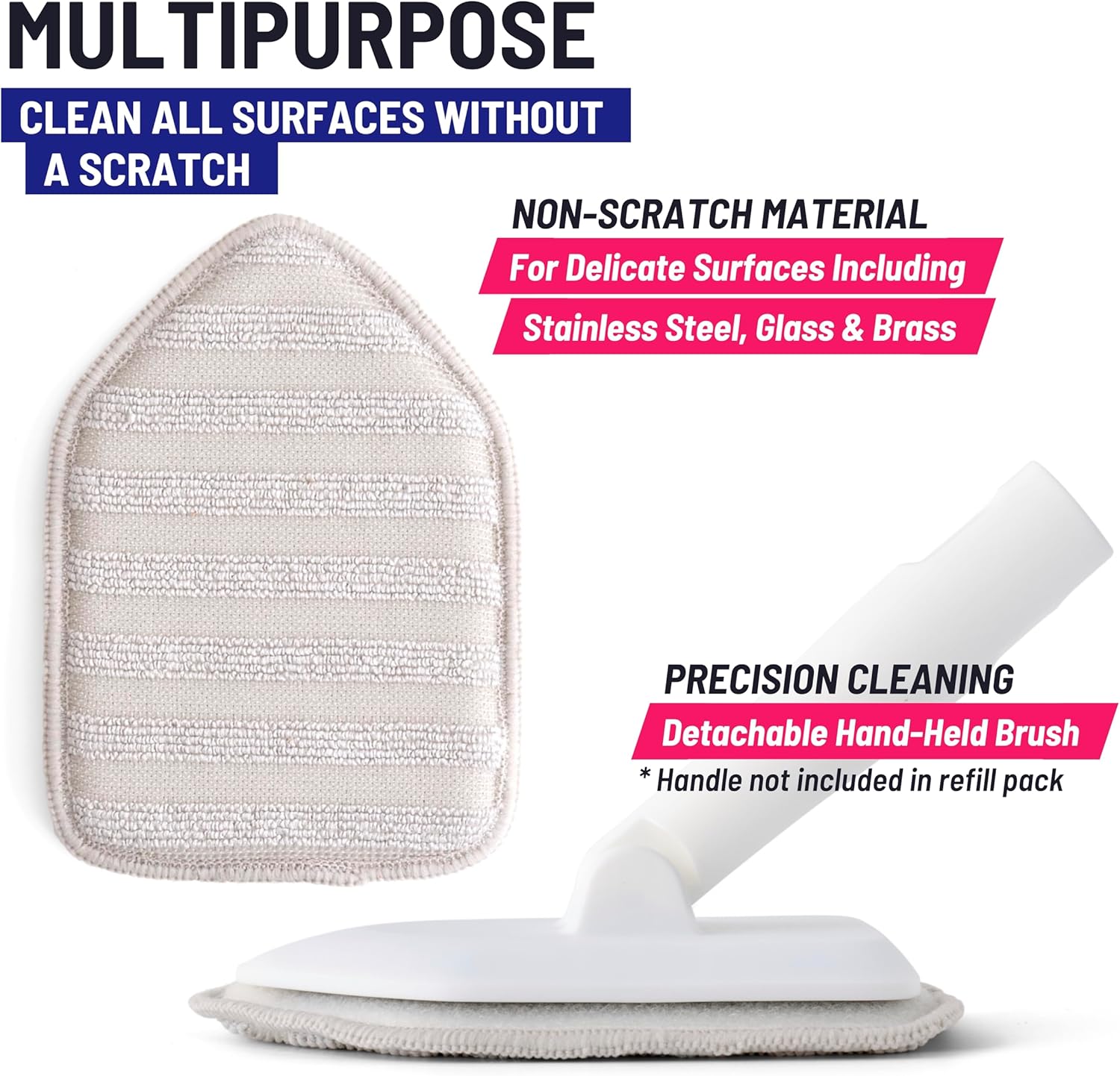 - 3-in-1 MULTIPURPOSE CLEANING -- The 2x Microfiber Pad Refills measure 6.5 inches in length x 4.5 inches in width and are made of non-scratch materials. Suitable surfaces include Porcelain, Ceramic, Marble, Mosaic, Fiberglass, Acrylic, Vinyl, Plastic, Wood, Zinc, Glass, Stainless Steel and Brass