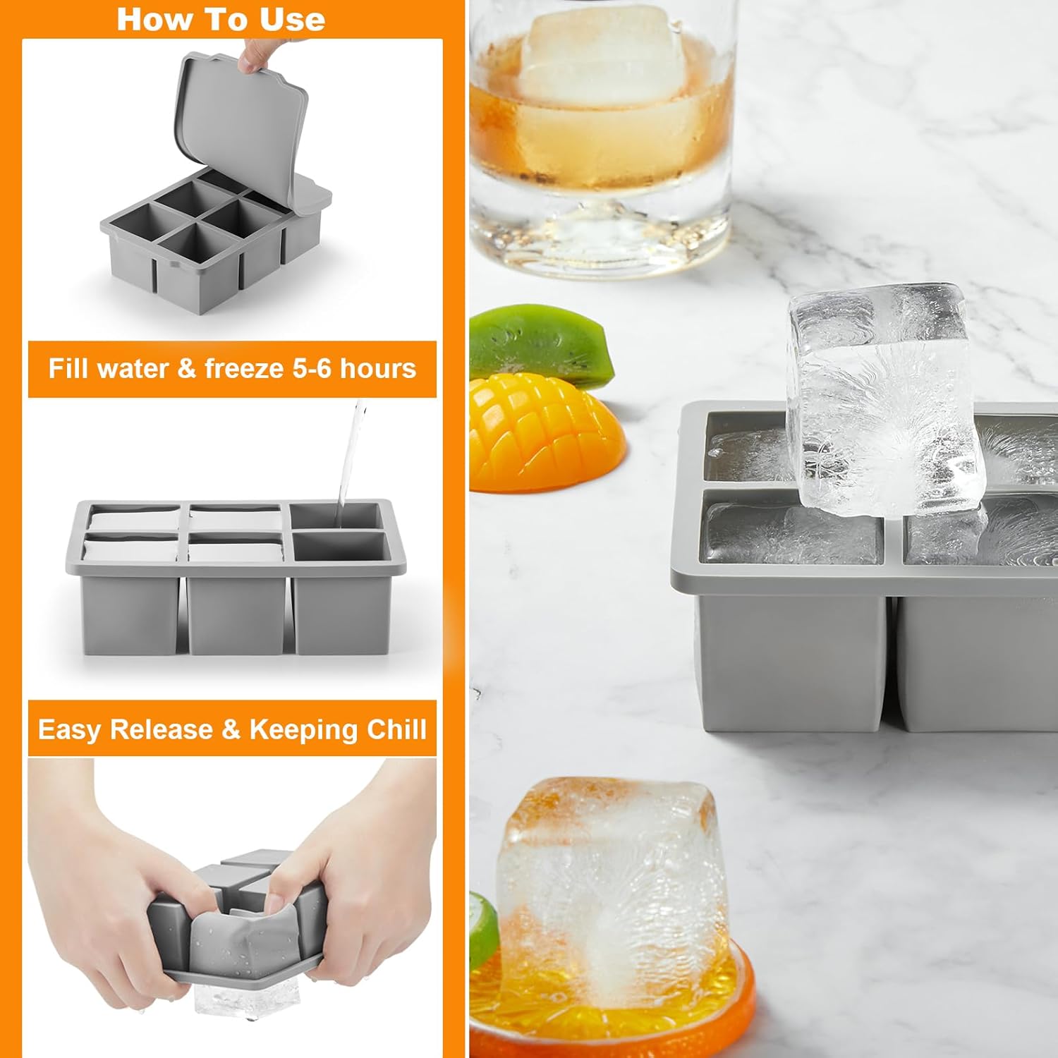 - Large Ice Cube Tray With Lid: 6 giant ice cubes per ice mold, 2 inch large per ice cube and shapes square; Perfect to chill cocktails, whiskey, tequila, vodka or other drinks with less dilution. You can also use these ice molds to freeze food in perfect portions, such as soup broth or sauce servings, recipes, baby food storage, meal prep, and portion controlled meals