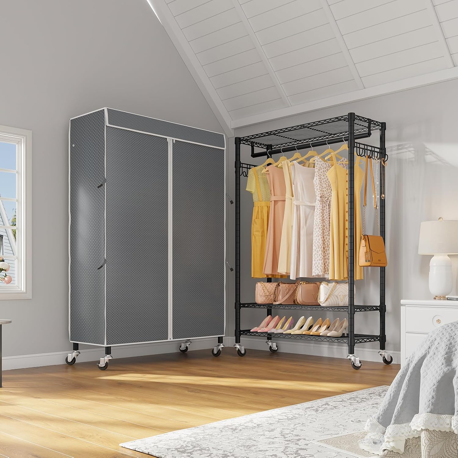 VIPEK R3C Rolling Clothes Rack with Cover Portable Closet for Hanging Clothes, Heavy Duty Garment Rack Clothing Racks with Wheels& Hanging Rod, Black Racks with Grey Upgraded Polyester Cover