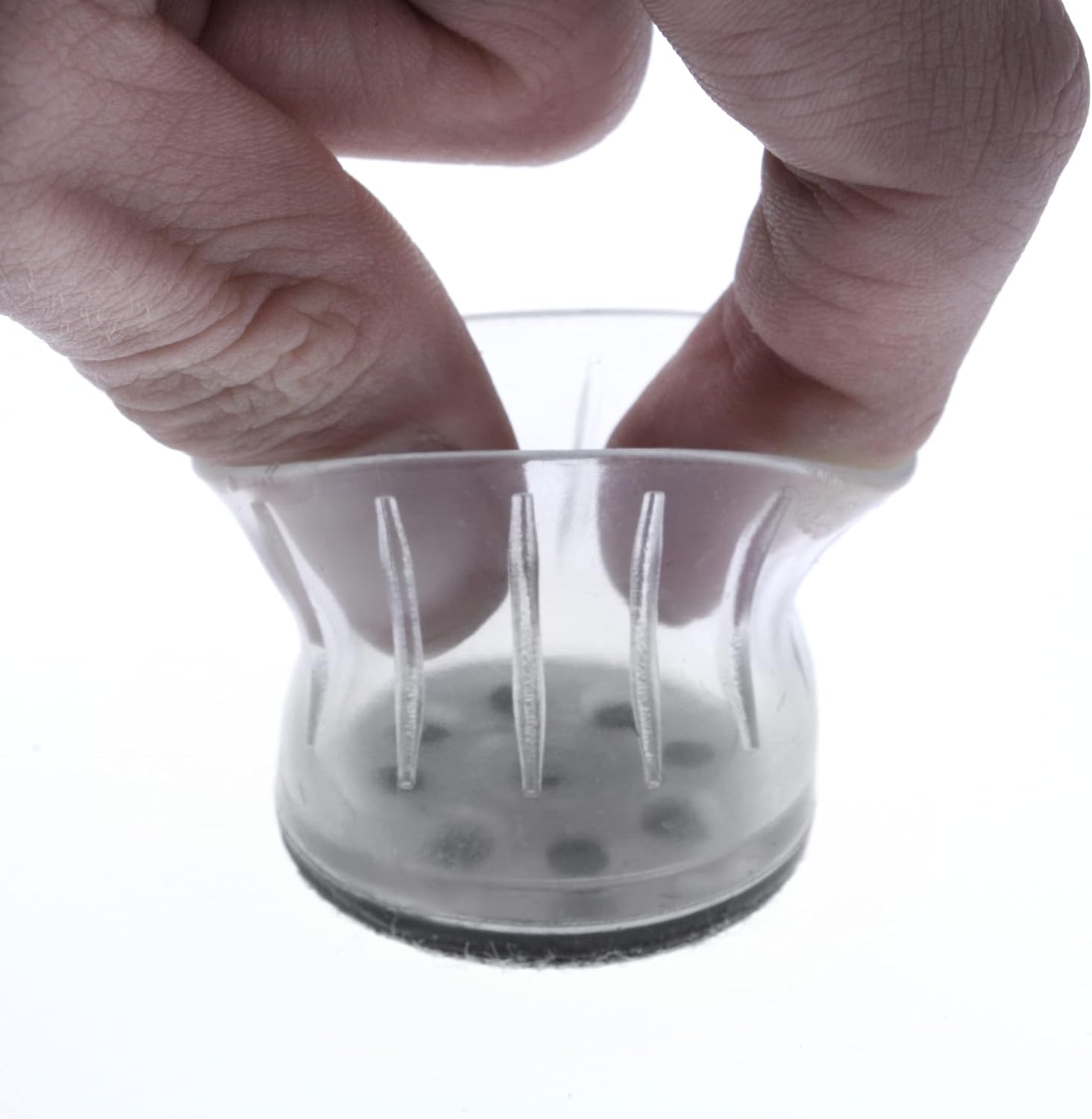 - Fits square and round furniture legs – These stretch to fit chair pads securely fit round legs 1-3/16” to 1-3/8” in diameter (30 – 35mm) and square legs 1-1/8” to 1-5/16” in diameter (28 – 33mm). The tube that holds the furniture leg is made of an advanced polymer material that is strong, tear resistant, long lasting, and clear for low visability.