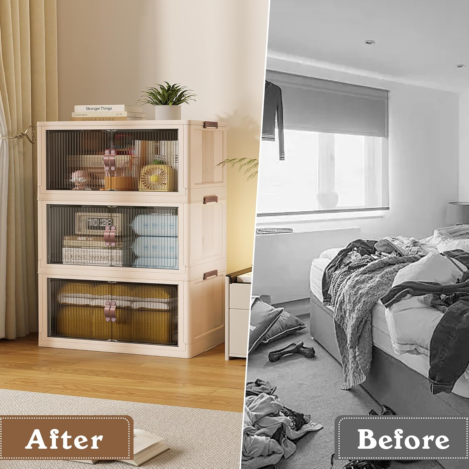 SAILUN 83Gal/335Qt Stackable Storage Bins Folding Collapsible Storage Bins with Lid, Closet Organizers and Box with Door Beige 26" W x 17" D x 43.7" H