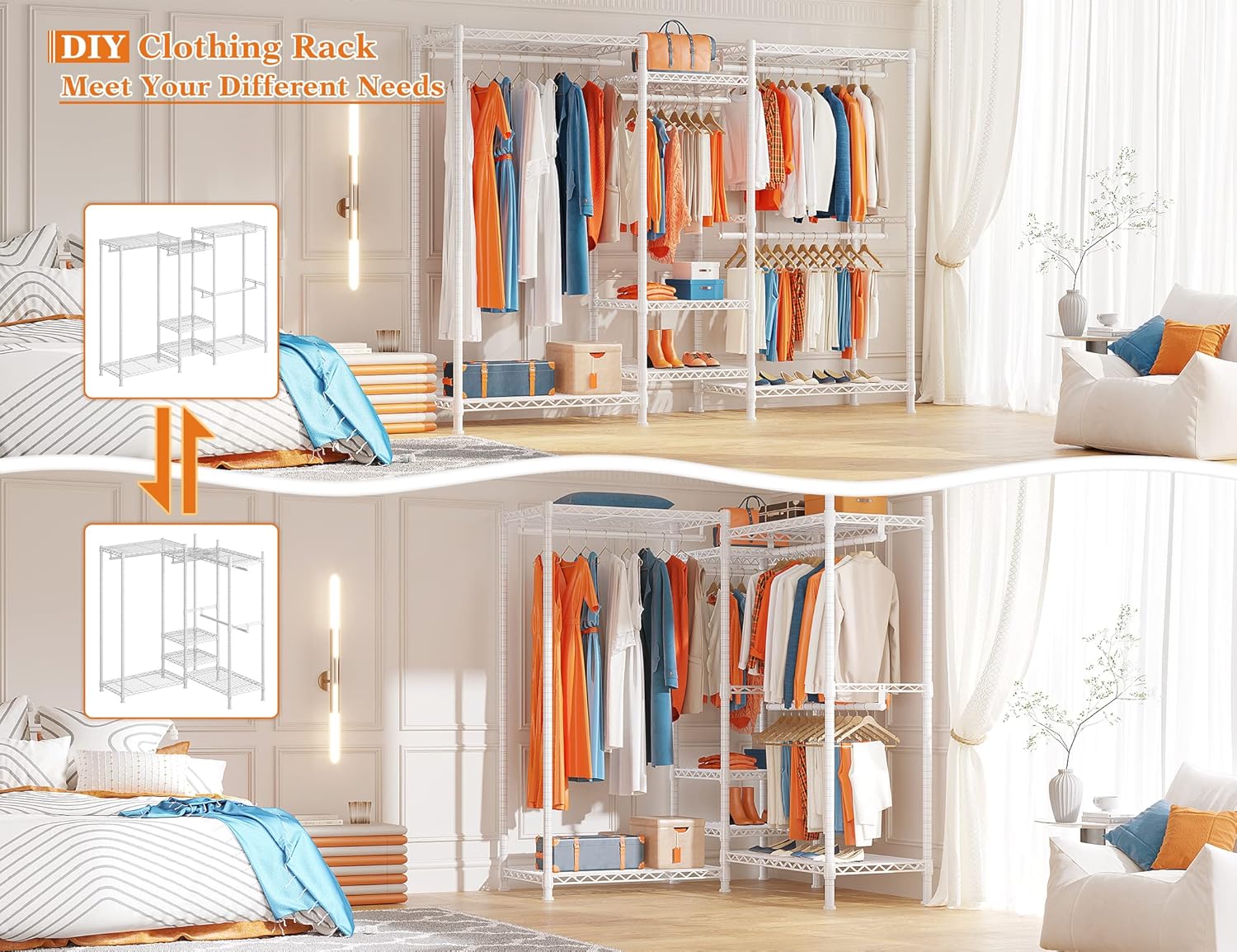 - 【Clothing Rack Load 750LBS Capacity】The clothing rack heavy duty is made of high quality metal poles and 4 hanging rods, each solid metal wire shelf holds 90LBS for a total weight capacity of 750 lbs. The each hanging rod of sturdy clothes rack can hold up to 115LBS.
