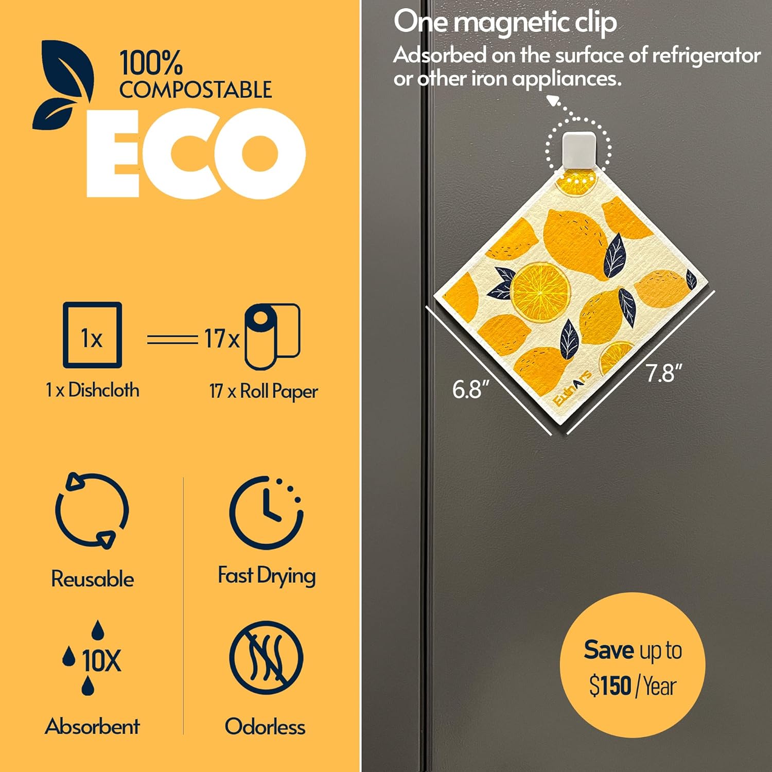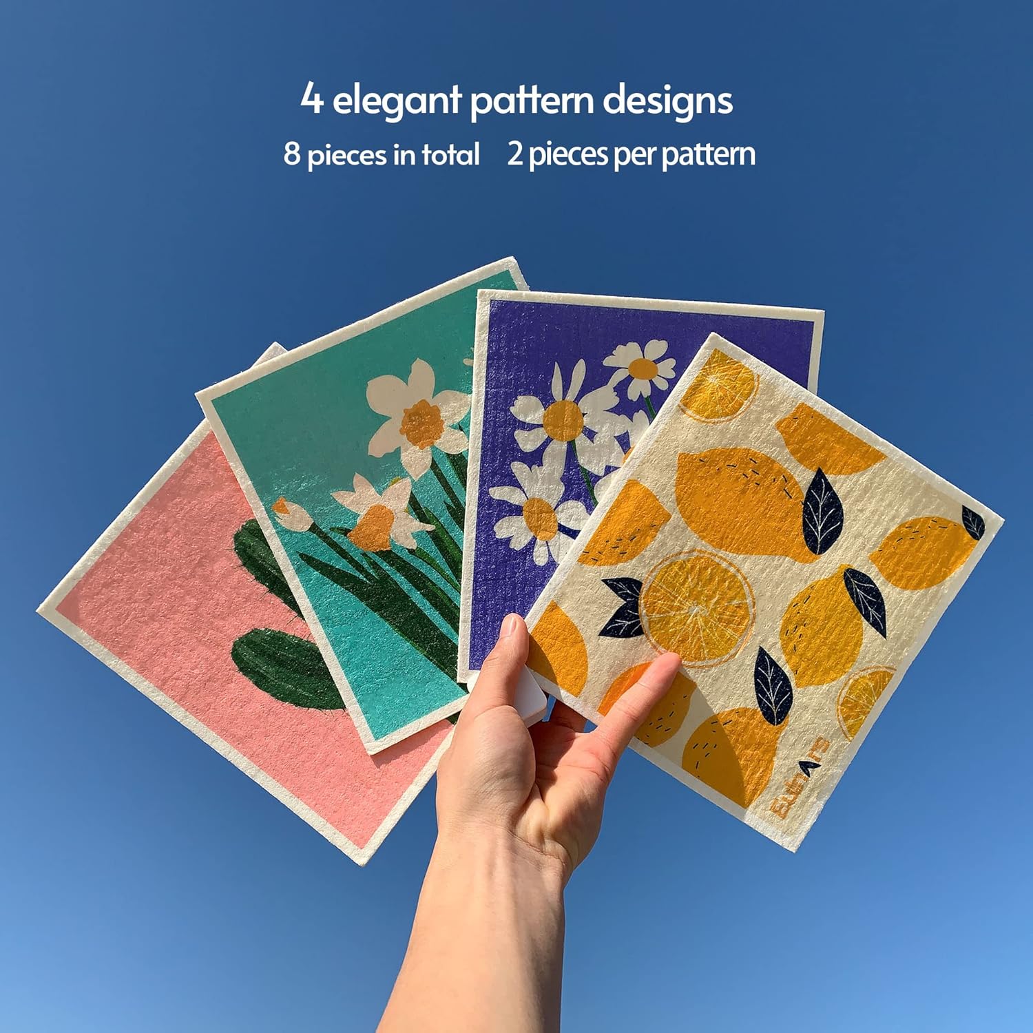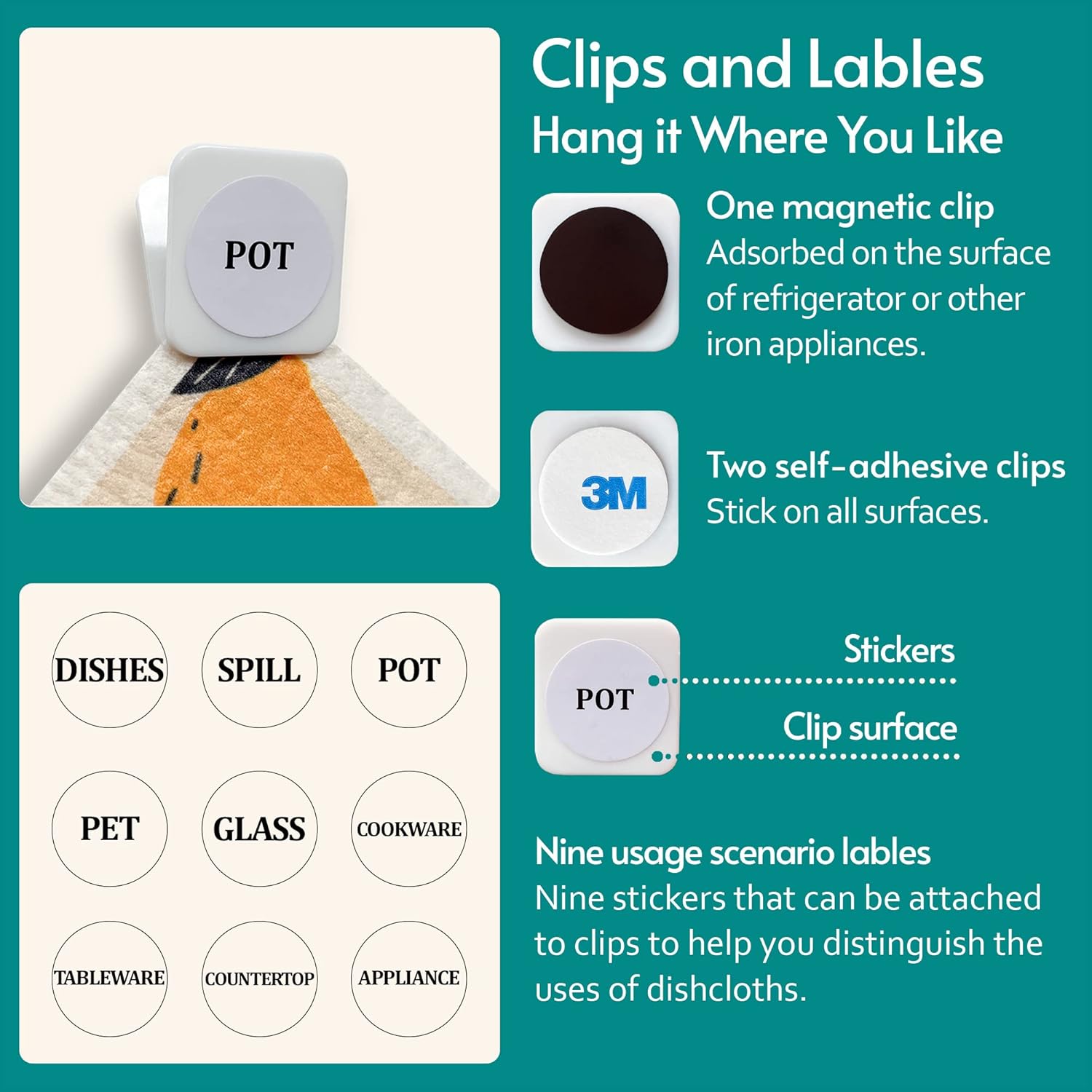- Easy to Clean and Store: Our swedish dish cloths, measuring 7.8 x 6.8 inches, each set comes with 8 cellulose dish cloths in 4 styles, along with 2 self-adhesive clips, 1 magnetic clip, and 9 labeling tags. Customize storage for easy access, hanging them on walls, counters, or refrigerators to keep your kitchen organized