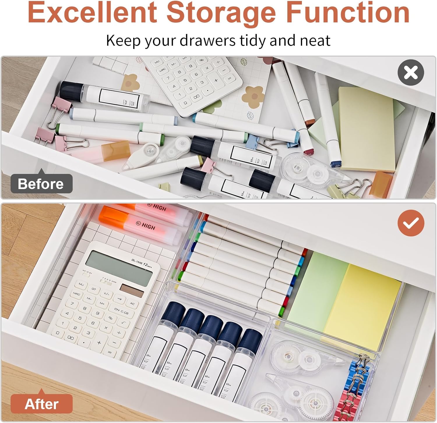 - Space Saving and Stackable Trays: Stackable drawer organizers can be stacked and sorted out in your space easily. Clear drawer organizers can save you time to organize and find your stuff, itβs easy to find and use your items in the drawer, keep your space neat, and help you get a neat lifestyle and enjoy more.